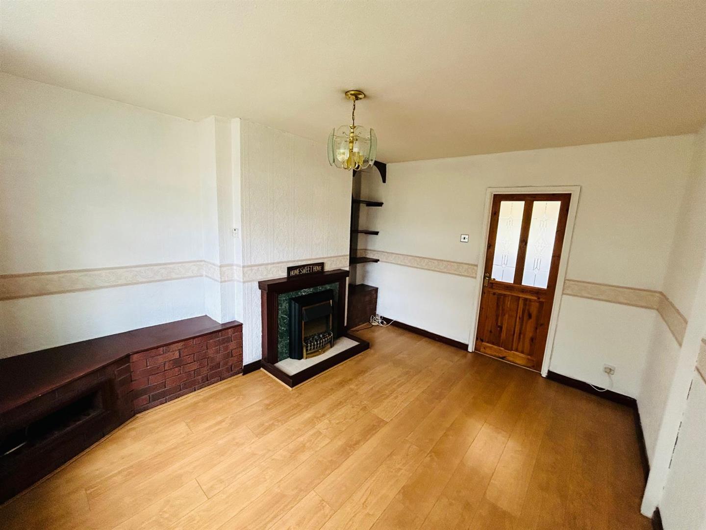 Having fireplace and laminated wooden floor.