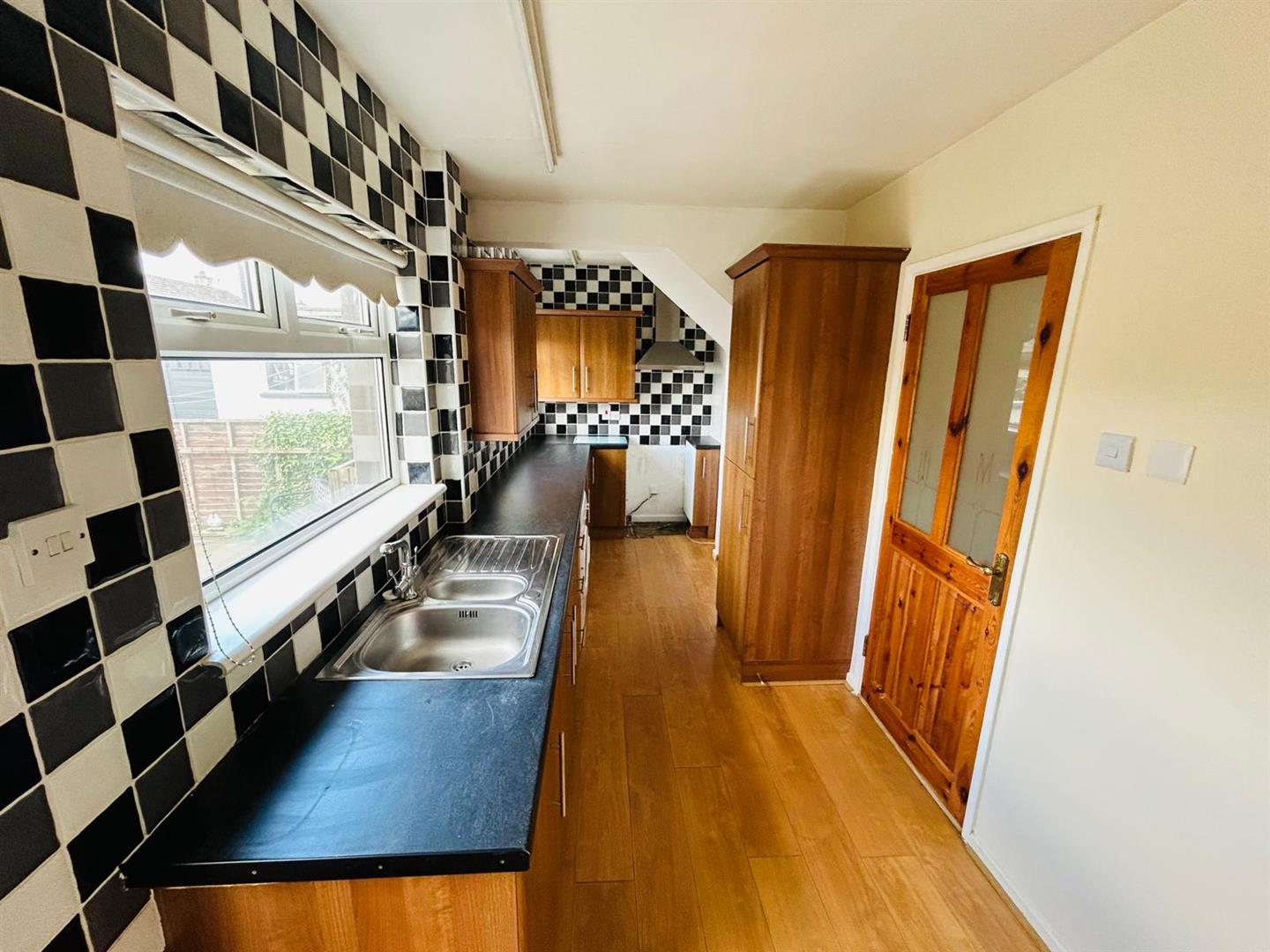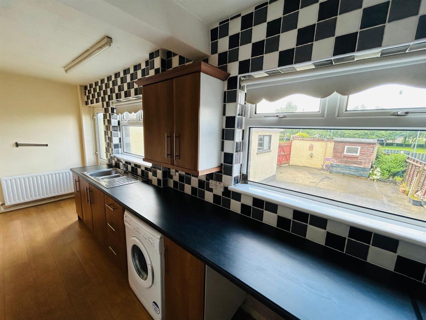 Having eye and low level units, tiling between units, 1 1/2 bowl single drainer stainless steel sink unit with mixer taps, wired for cooker, stainless steel extractor hood, plumbed for washing machine, laminated wooden floor.
