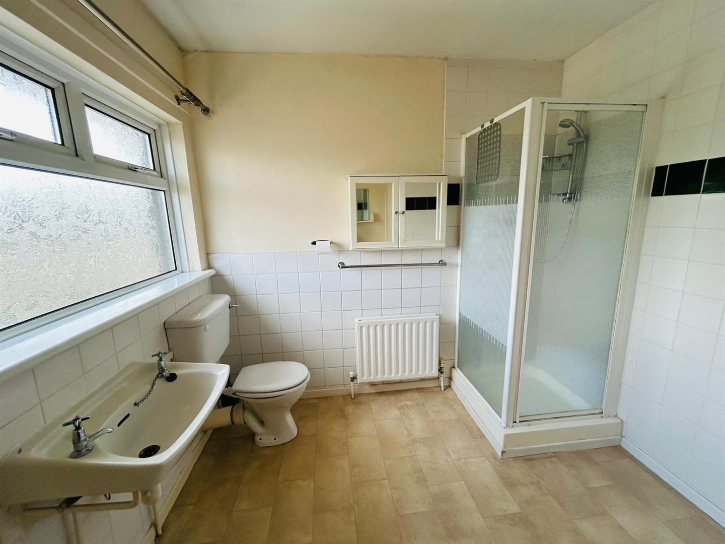 Comprising walk in shower with PVC cladding to walls, whb and wc, partly tiled walls, airing cupboard.