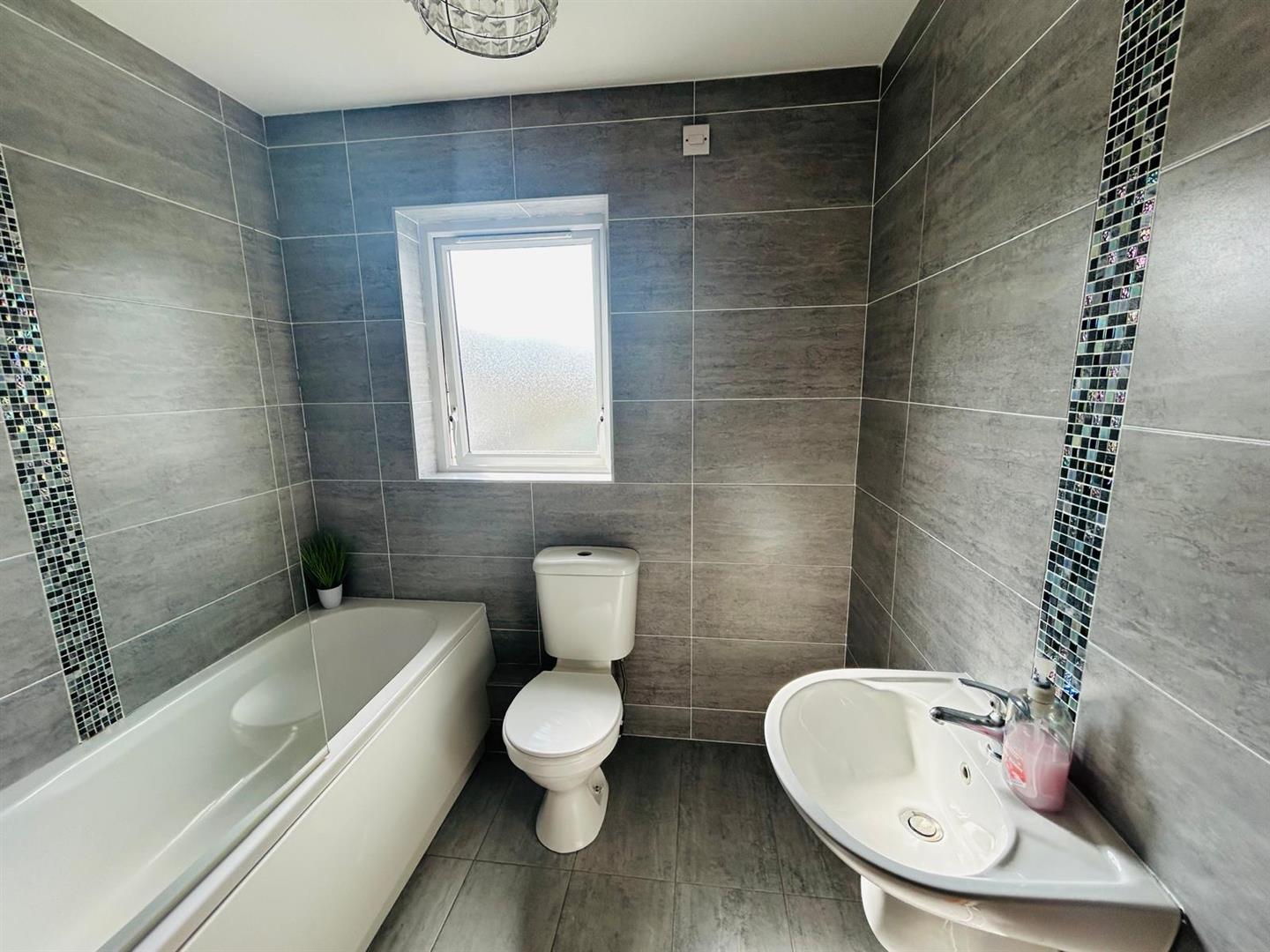 Comprising bath with electric shower over, shower screen, whb and wc, fully tiled walls and floor.