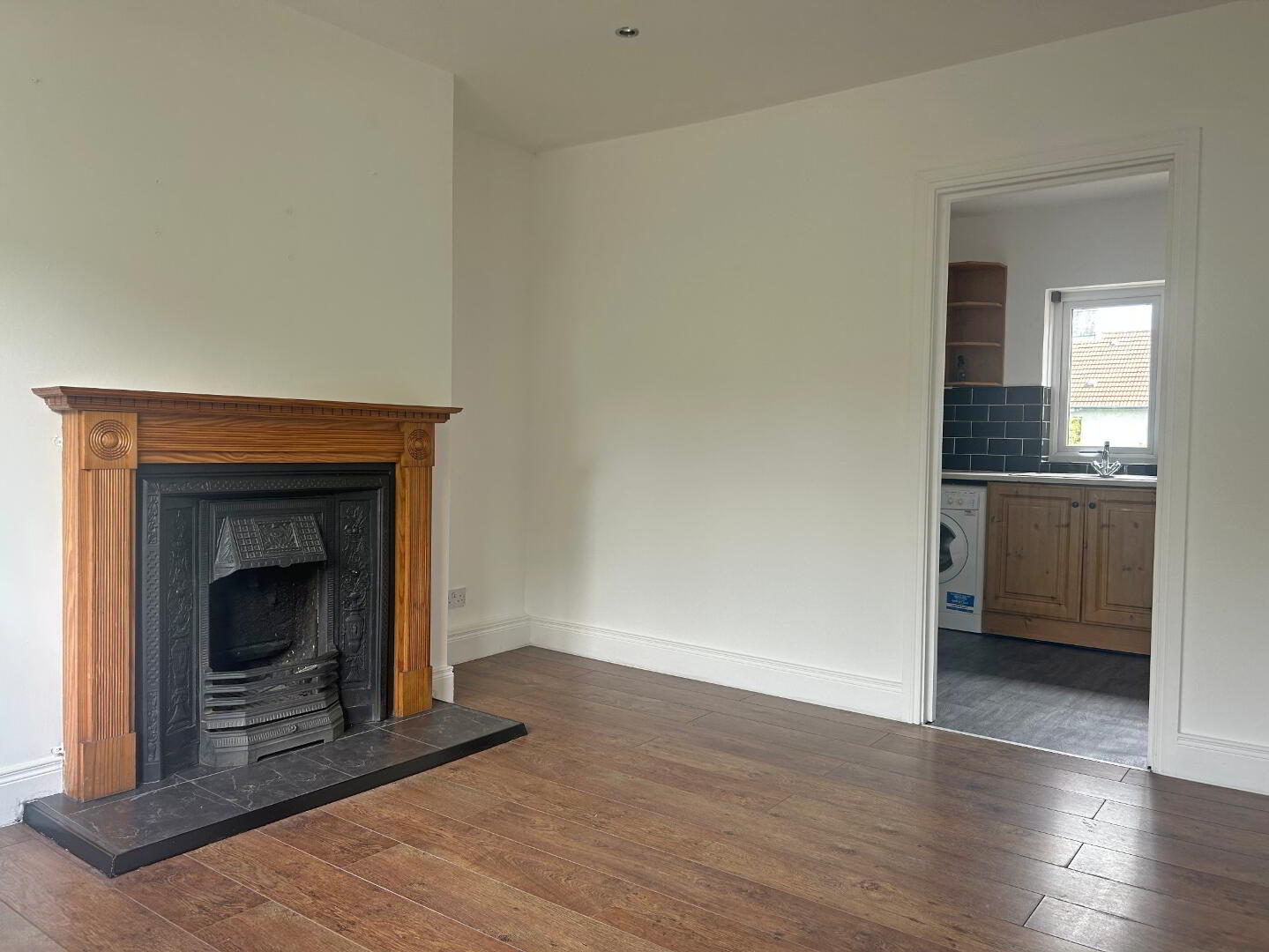 Open fire set into fireplace with timber surround and back boiler