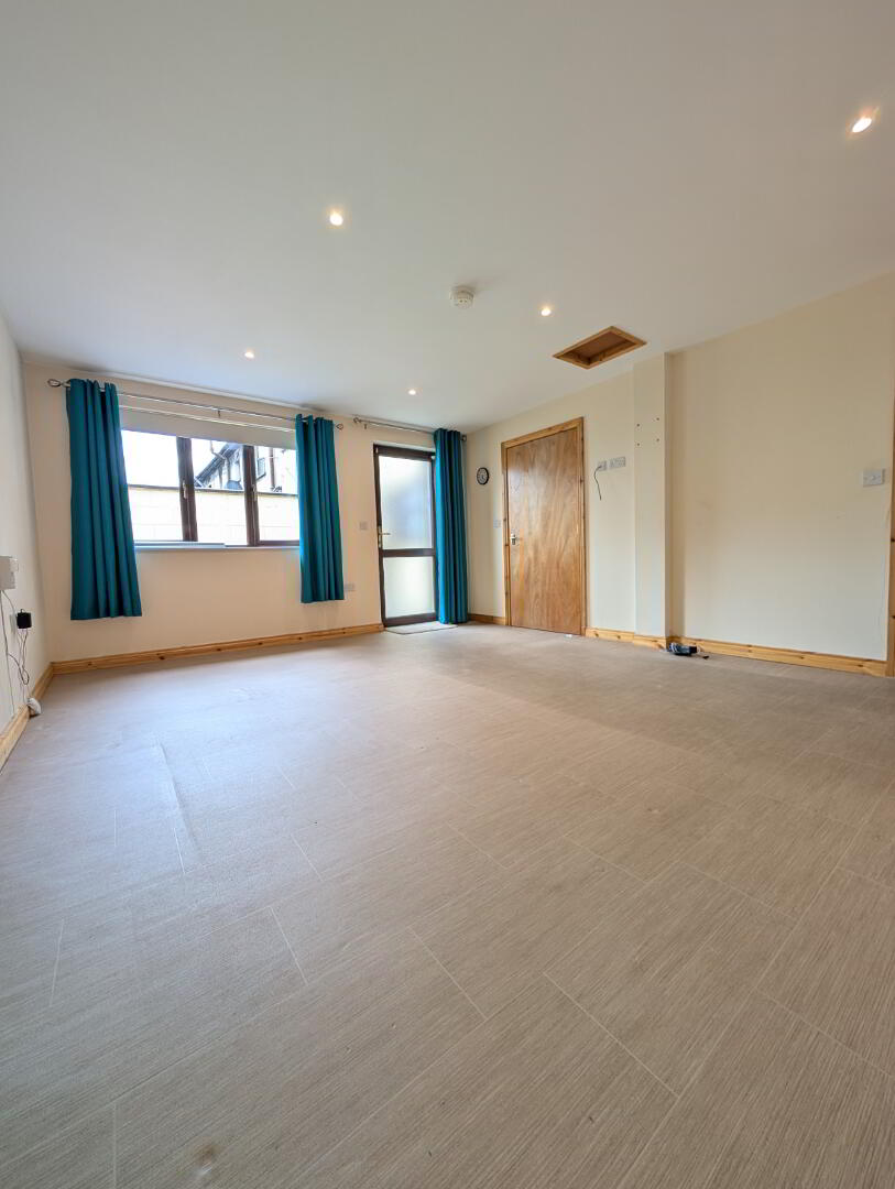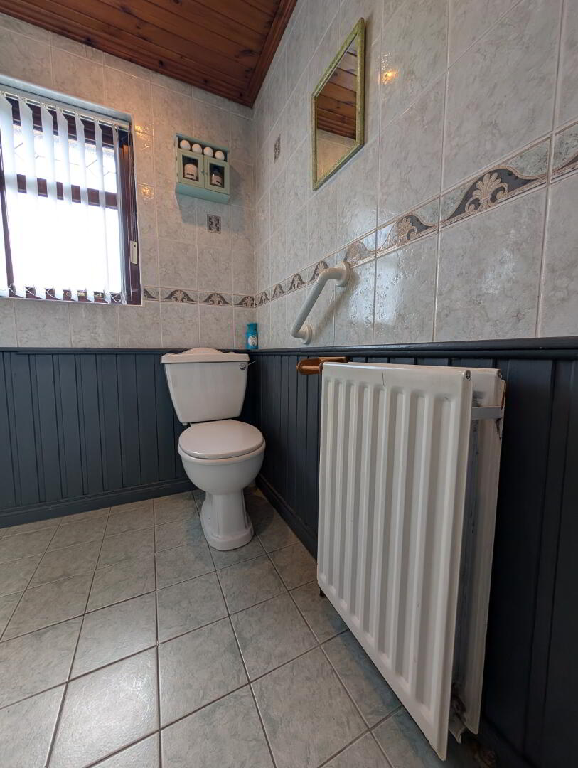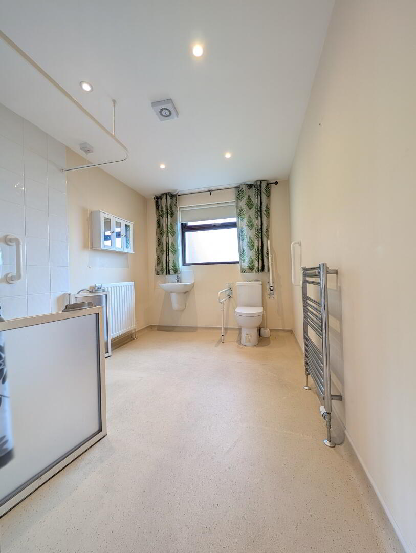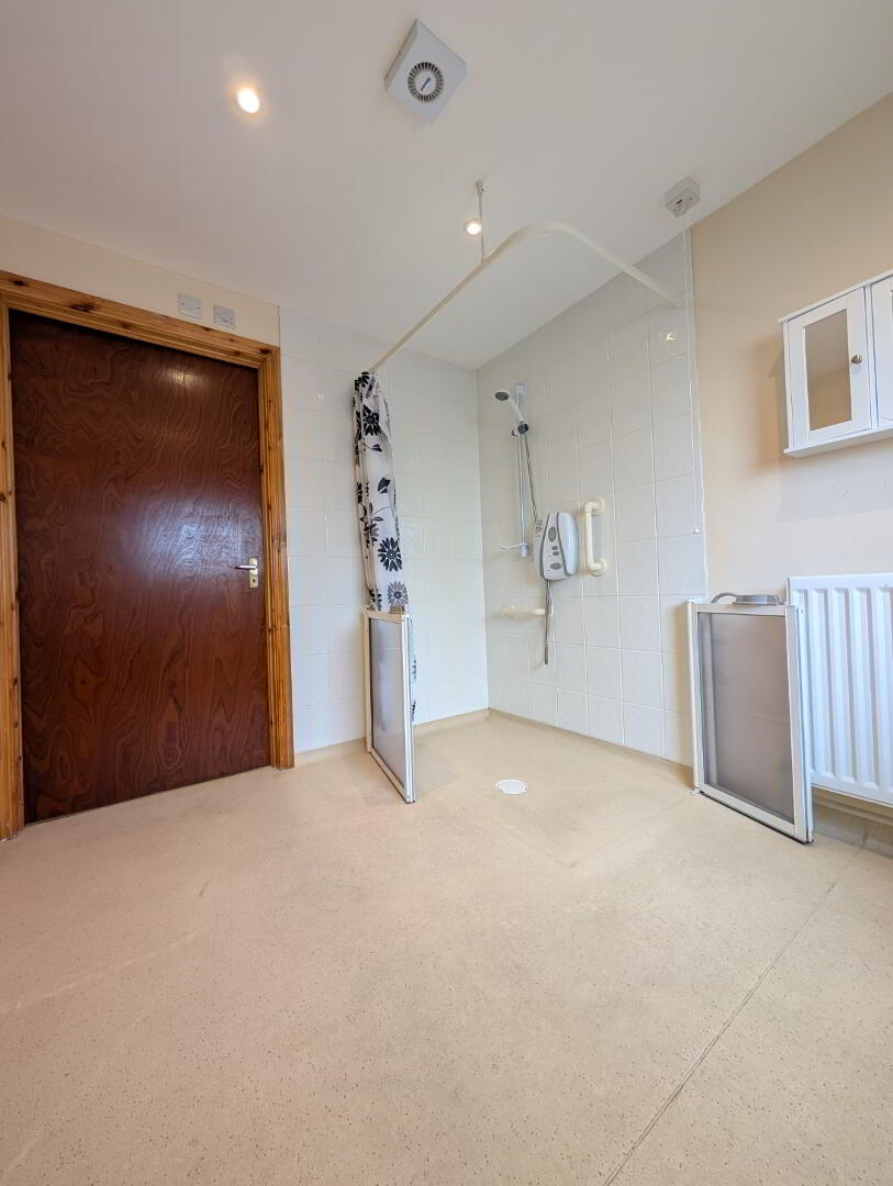 7’ 4” x 9’ 6” (2.24m x 2.88m at widest) Tile effect floor, white suite to include button flush WC, wall mounted WHB with mono tap and tile splash-back, walk-in shower with Redring electric shower, chrome effect heated towel rail, recessed spot lighting