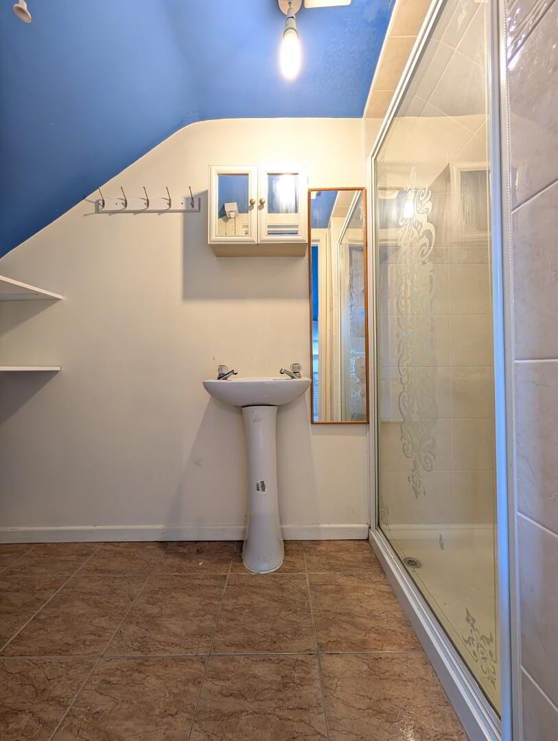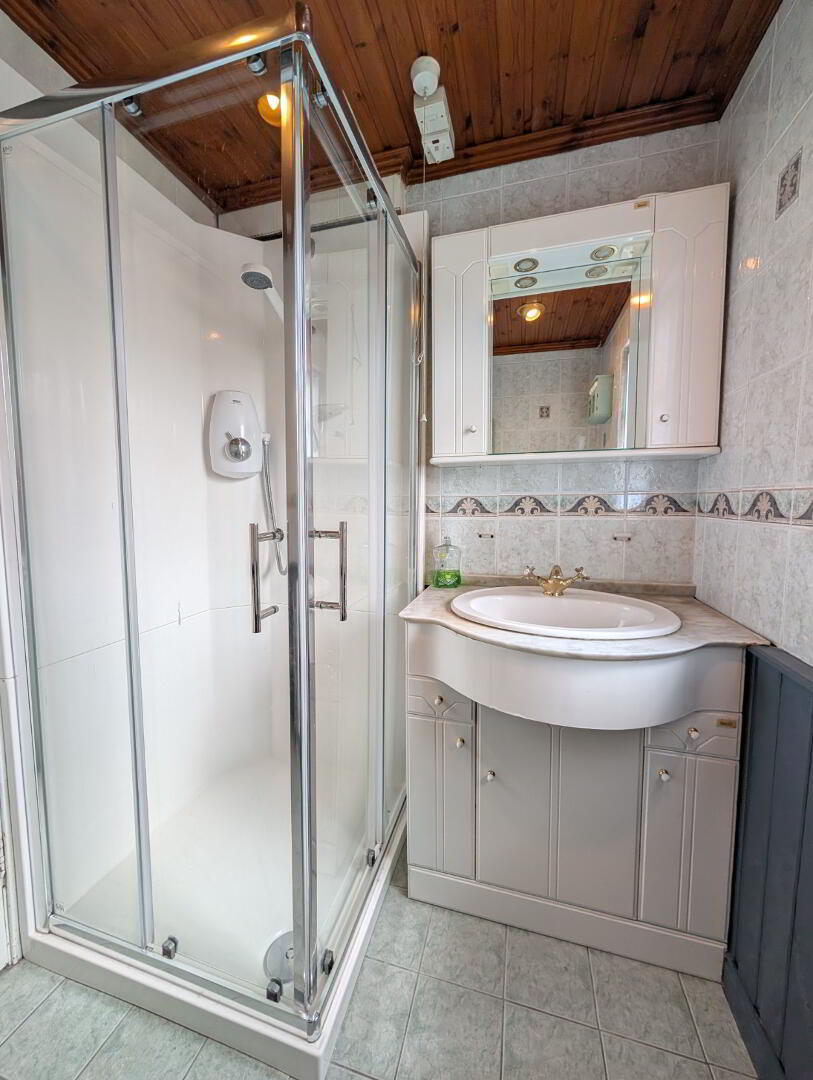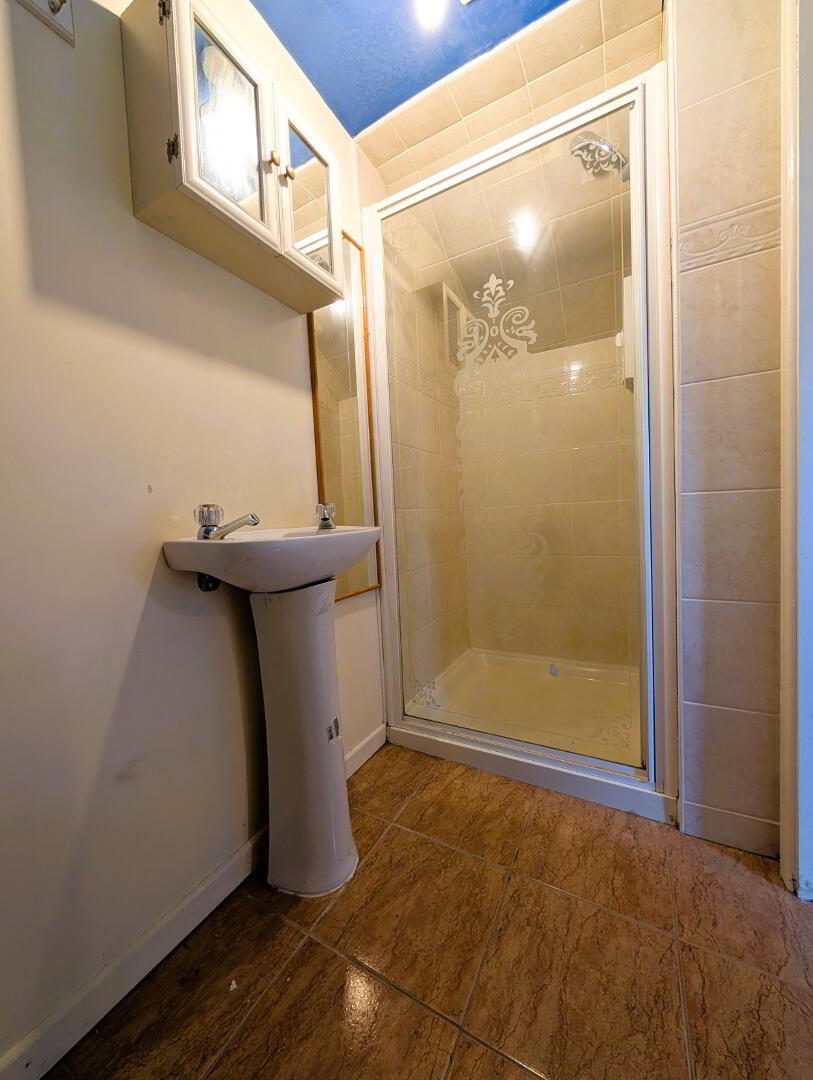 Tile floor, pedestal WHB, shower enclosure with electric shower