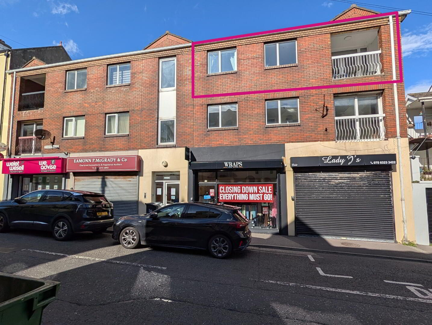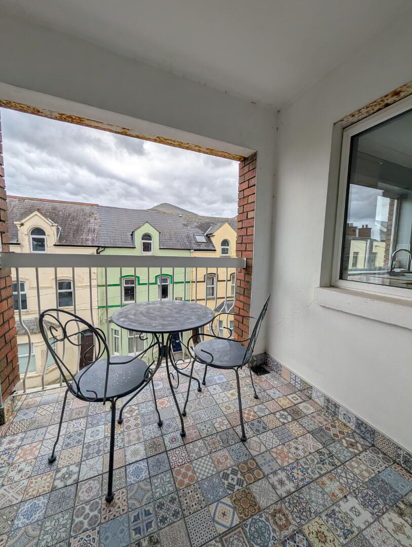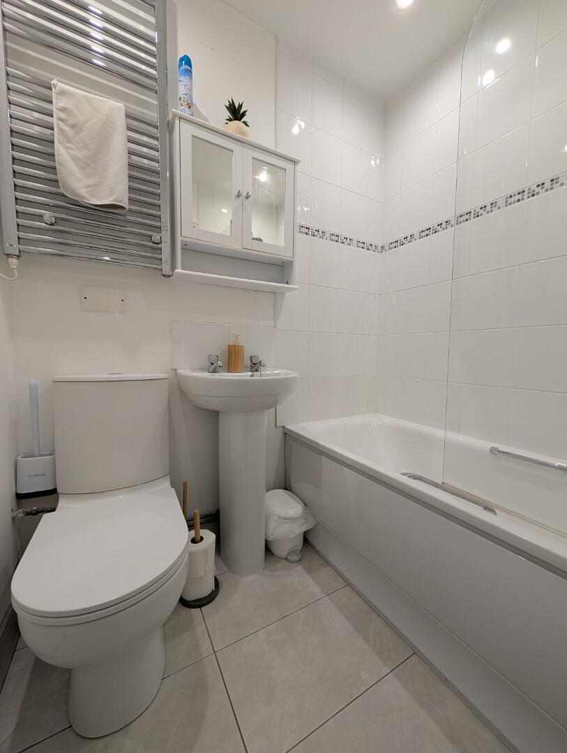 White suite comprising low flush WC, WHB & panel bath with overhead electric shower and screen, tiled throughout