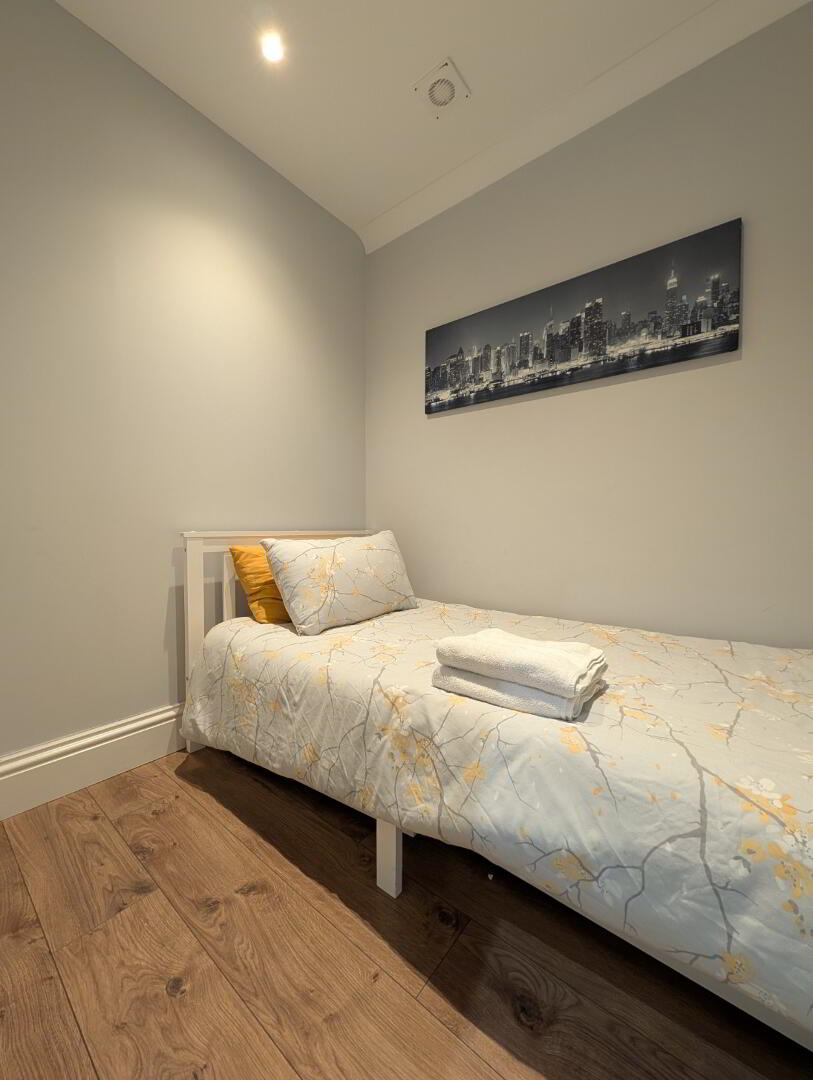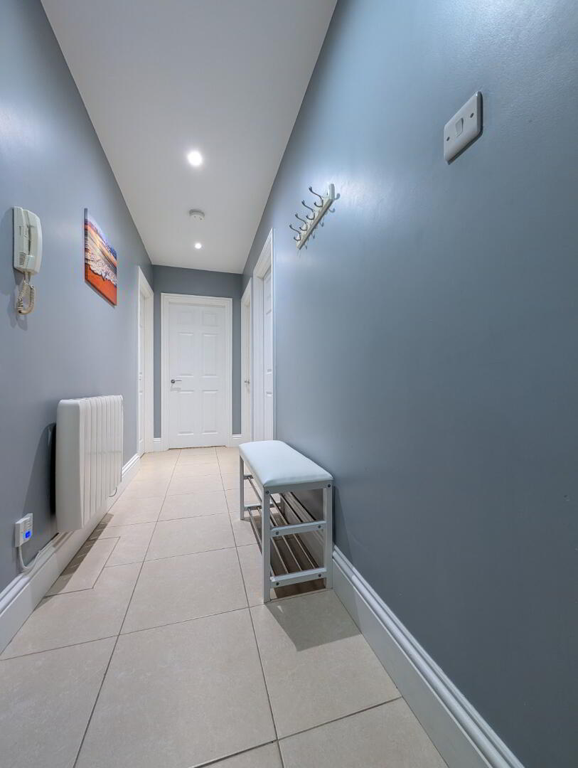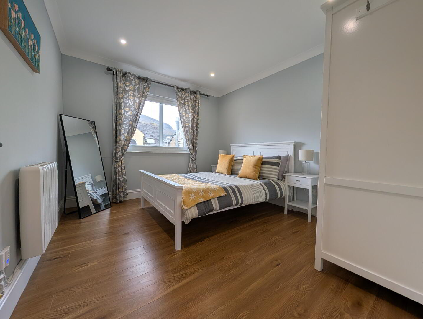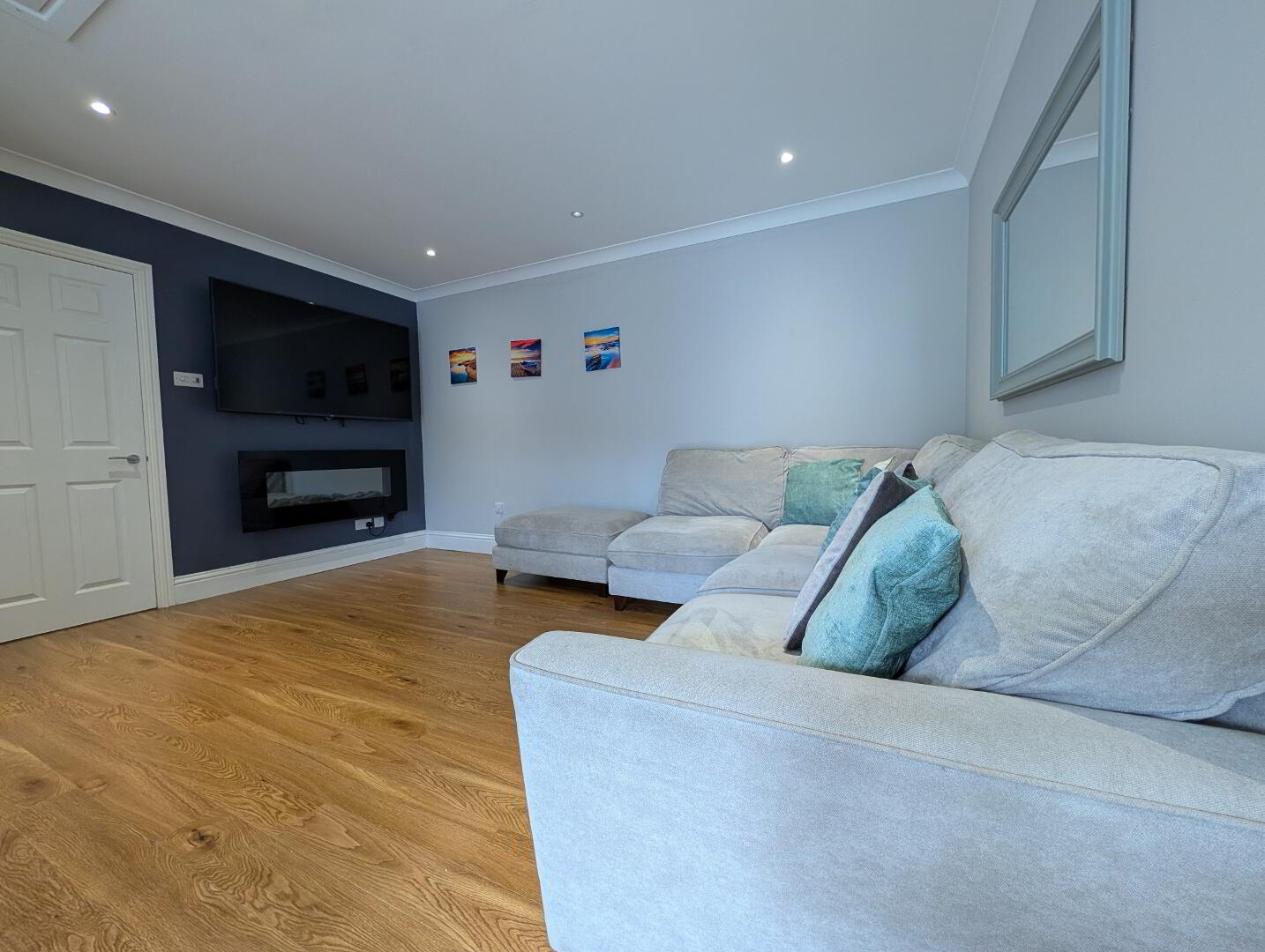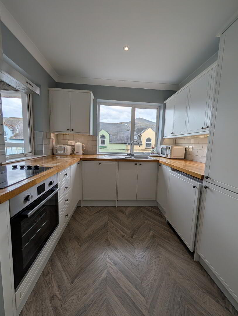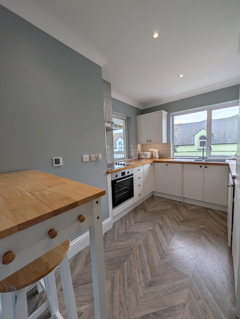 Herringbone floor, range of high & low soft close kitchen units, tiled splash-back, laminated work surfaces, integrated oven / hob, fridge/freezer, washing machine