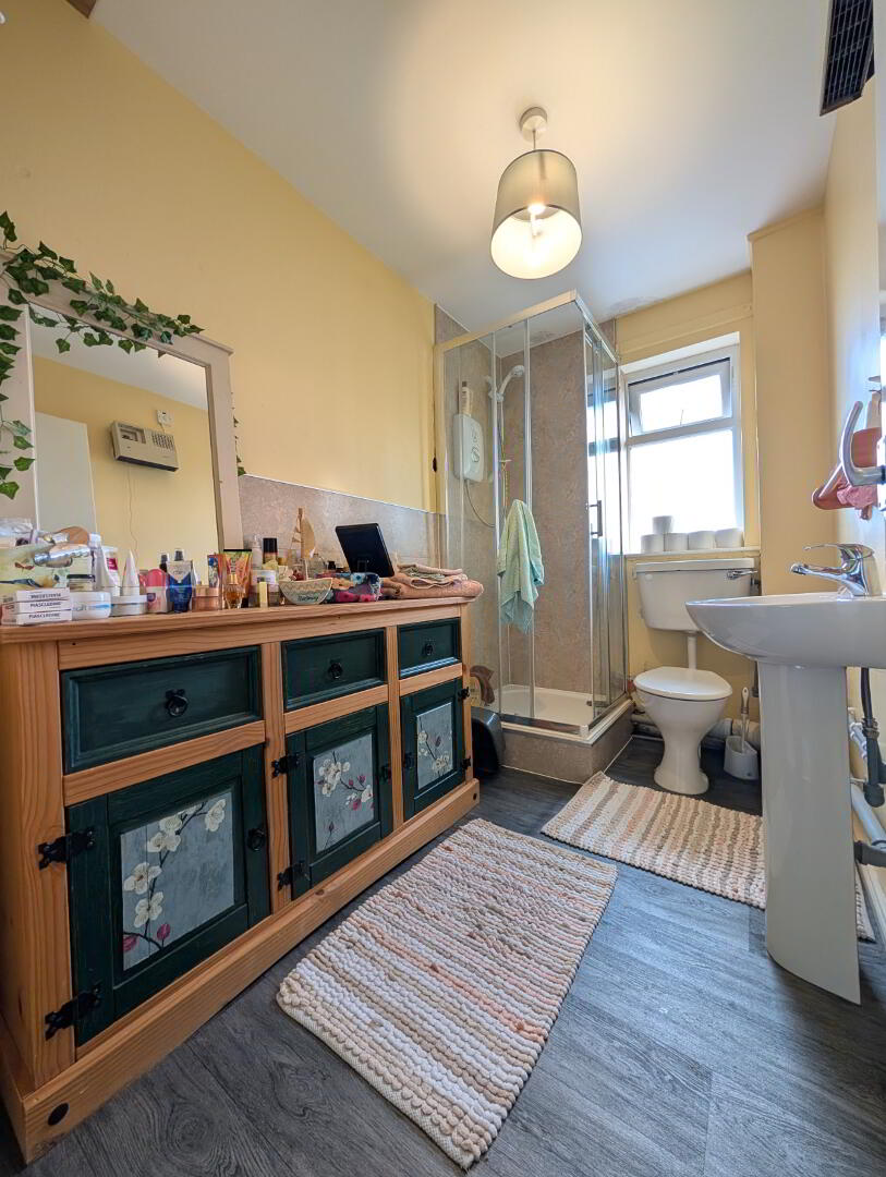 8’9” x 5’0” (2.66m x 1.52m at widest) White suite comprising low flush WC, pedestal WHB & shower enclosure with electric shower, wooden effect floor