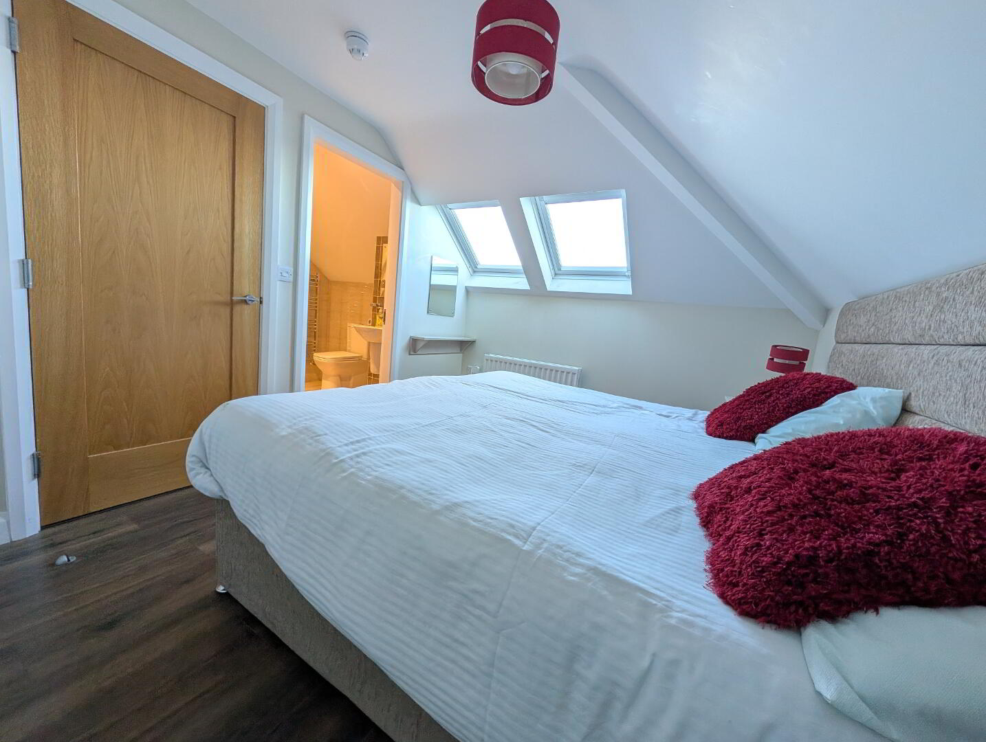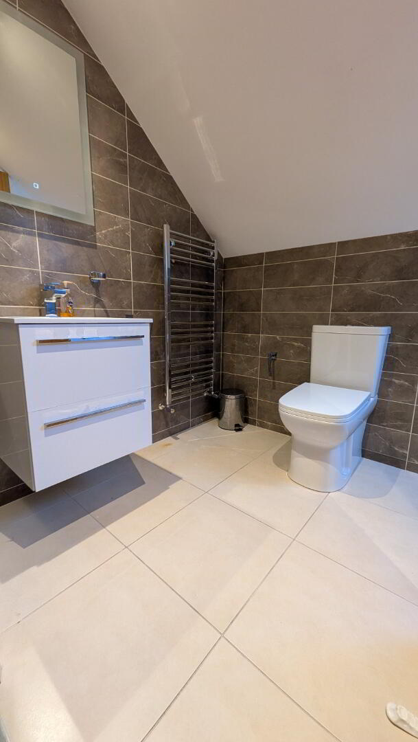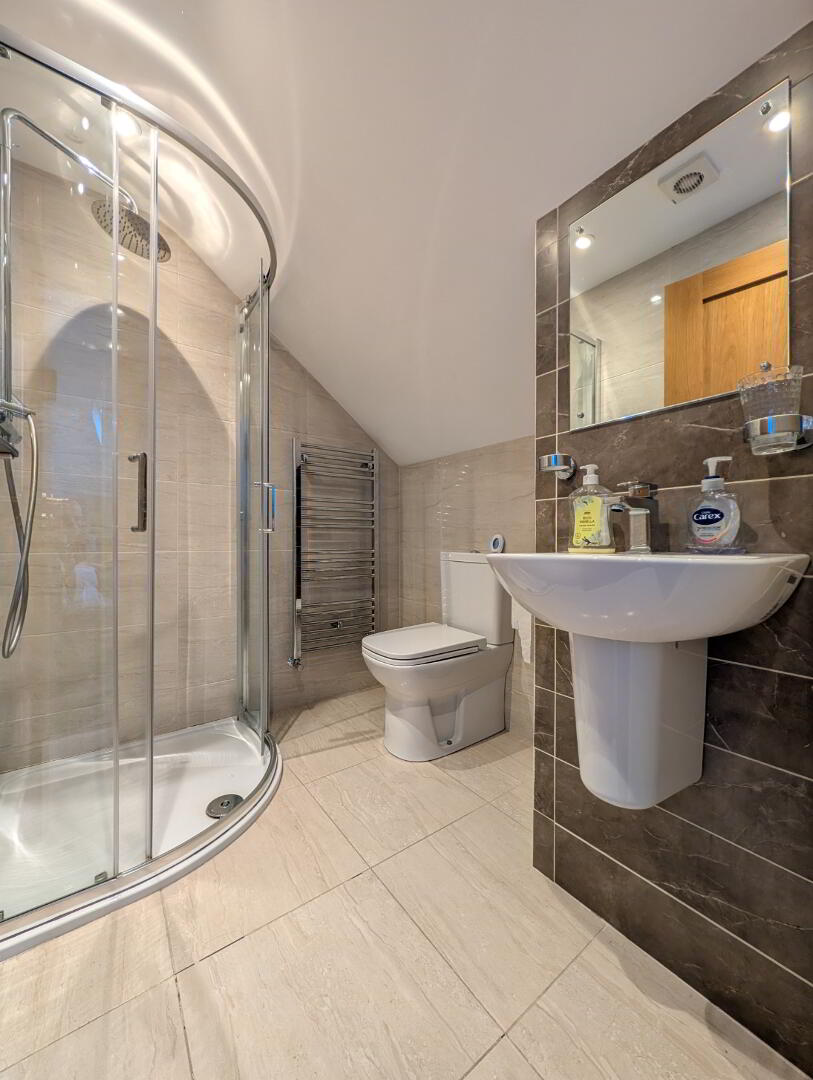 White suite comprising low flush WC, quadrant shower cubicle with thermostatic power shower, recessed spot lighting, fully tiled throughout