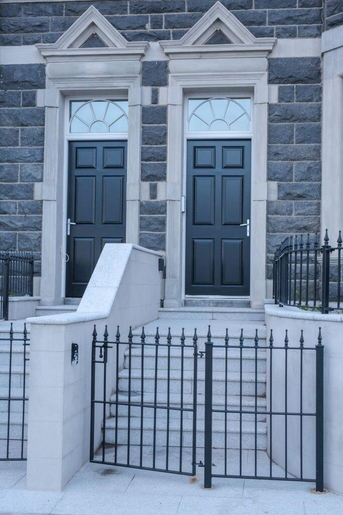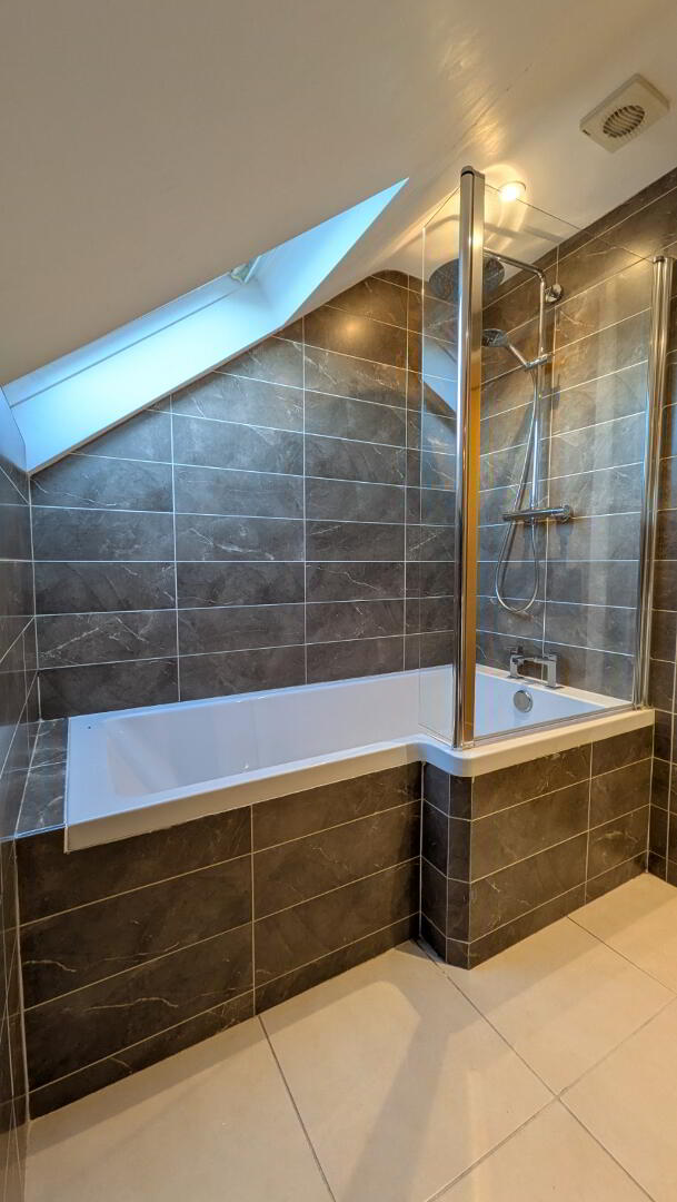 White suite comprising low flush WC, WHB, bath with overhead thermostatic shower, recessed spot lighting, fully tiled throughout