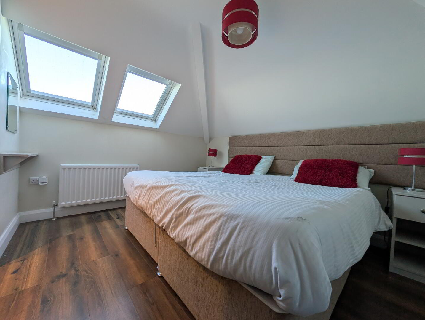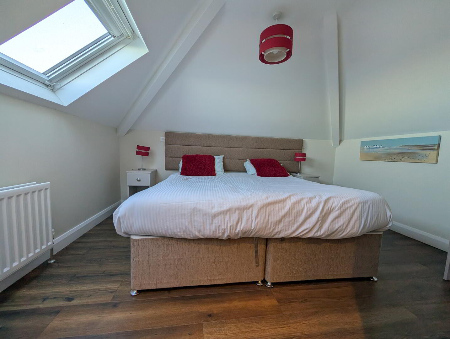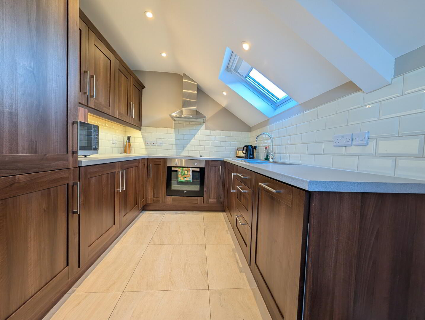Tile floor, range of high and low level soft close units, integrated oven/hob/extractor, integrated fridge/freezer, tiled splash-back, recessed spot lighting