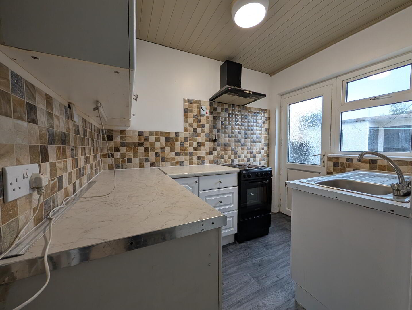 5' 9" x 8' 0" (1.74m x 2.45m at widest) Wooden effect floor, range of high- & low-level kitchen units, laminated work surfaces, tile splashback, free standing cooker with overhead extractor, 1 ½ bowl sink & drainer, PVC door with glazed panel opening to rear gardens
