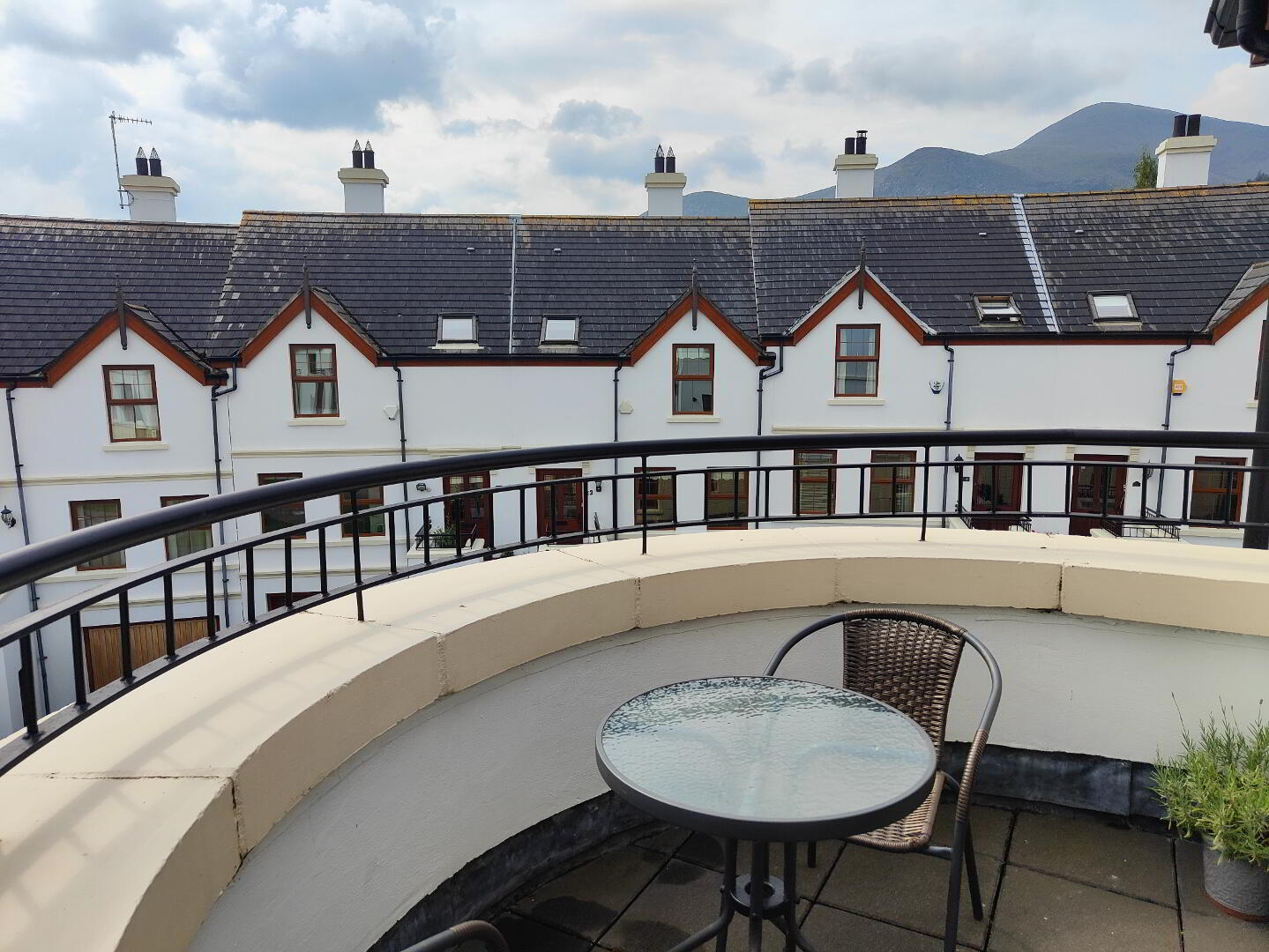 Kitchen – Highly polished porcelain tile floor continued through from hall, range of high and low level shaker style units, feature island/breakfast bar with storage, laminated work surfaces, integrated fridge/freezer, electric hob, oven and extractor, stainless steel sink and drainer, plumbed for appliances, mahogany effect PVC French doors opening on to balcony