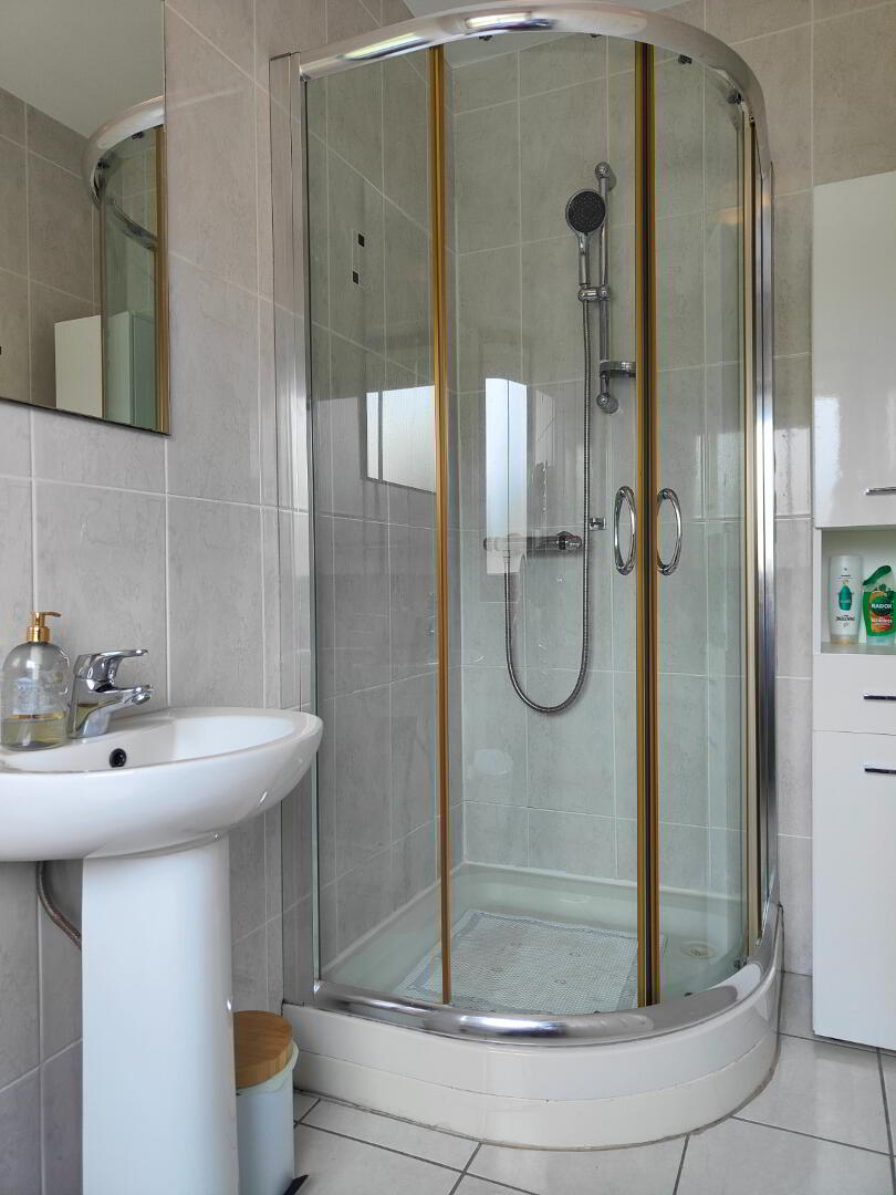 White suite comprising of button flush WC, pedestal WHB, quadrant shower cubicle with thermostatic power shower, fully tiled walls and floor