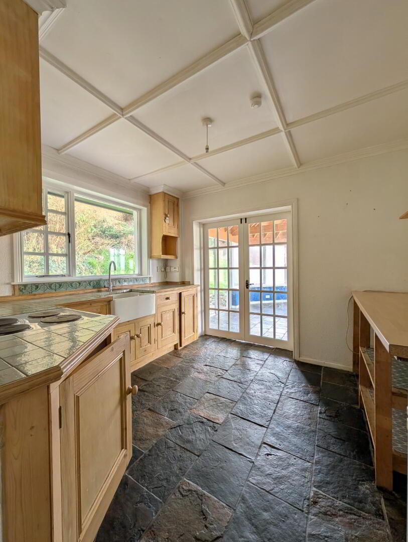 11'1" x 9'2” (3.4m x 2.8m at widest) Rustic slate floor, range of high- & low-level solid wood farm-house style kitchen units, tiled work surfaces & splash back, Belfast sink with mono tap, glazed French doors opening in to…