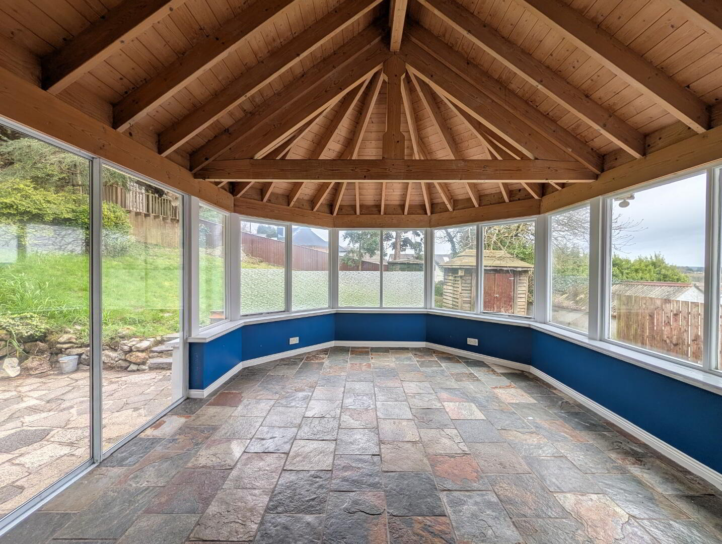 14’5” x 12’9” (4.4m x 3.9m at widest) Rustic slate floor continued, feature exposed ceiling beams, sliding patio doors opening to rear gardens