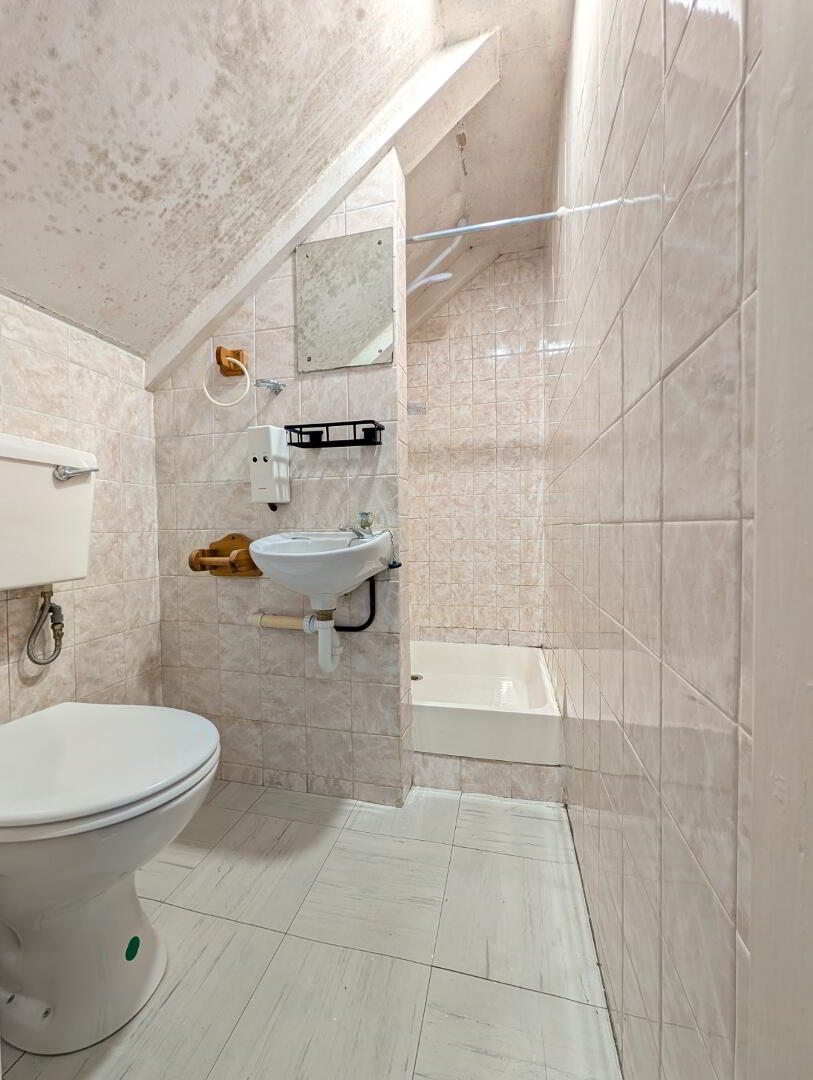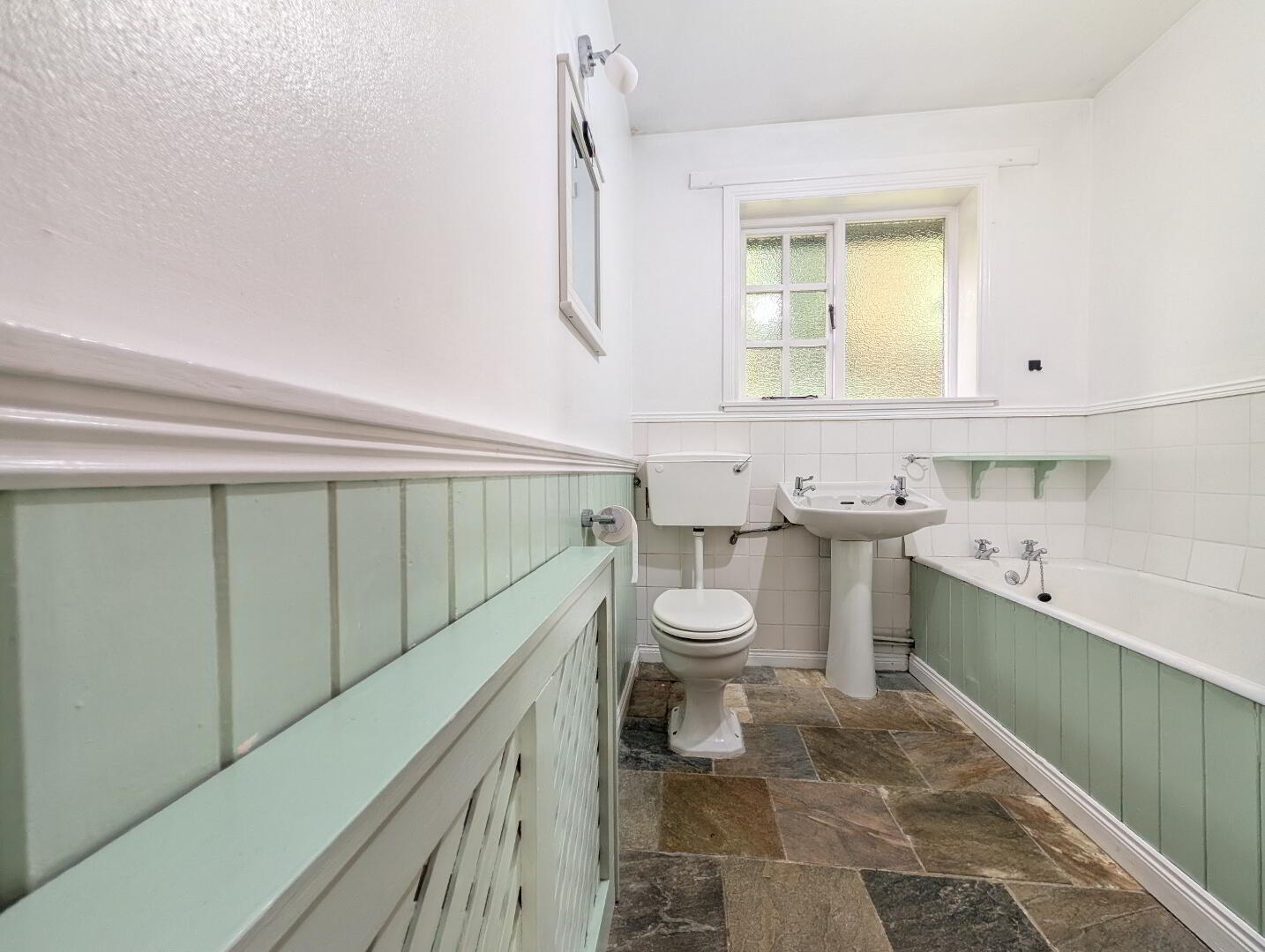 6’ 0” x 6’ 11” (1.83m x 2.12m at widest) White suite comprising low flush WC & pedestal WHB, panel bath, rustic slate floor