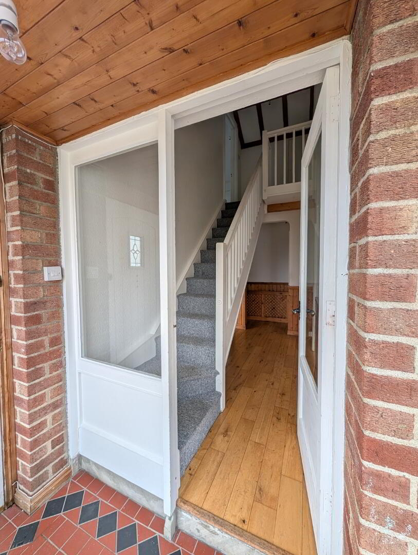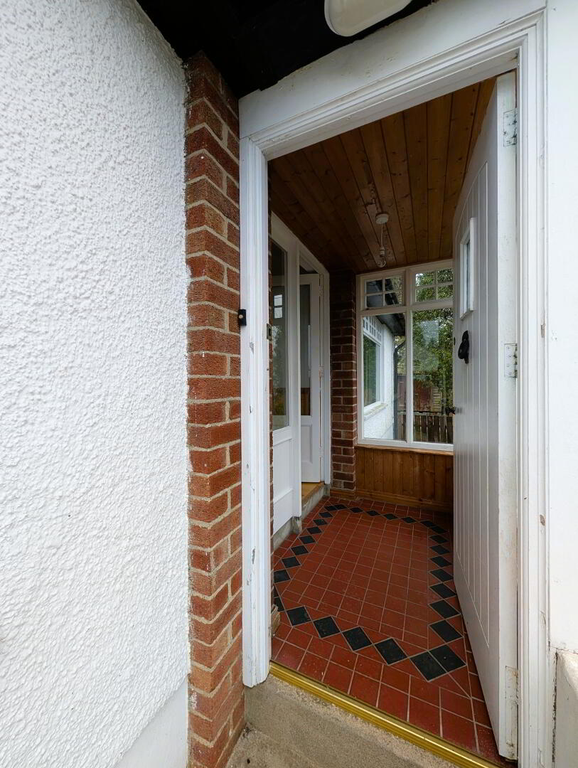 Belfast brick surround, hardwood door opening into porch with antique terracotta quarry floor tile, solid pine panelling to walls & ceiling, through to…