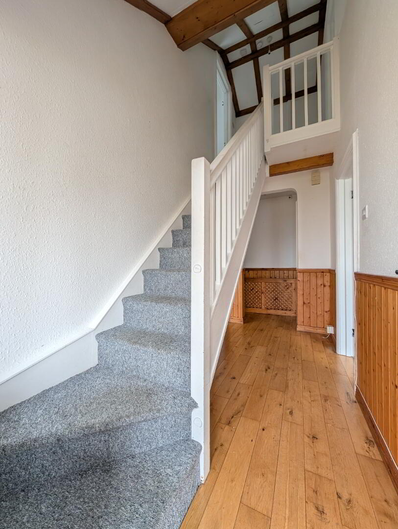 Carpeted staircase with handrail onto landing, exposed beams to ceiling