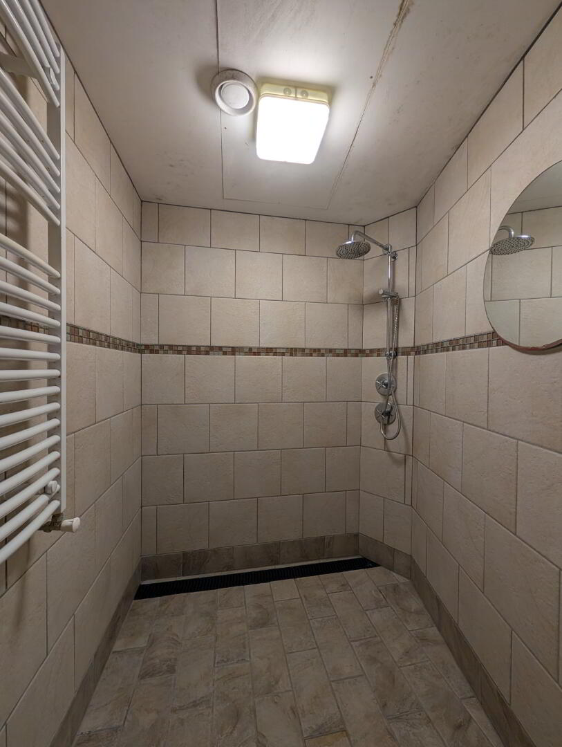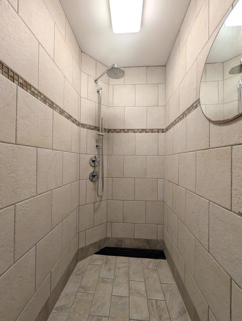 Fully tiled, thermostatic shower with rainfall and handheld fittings