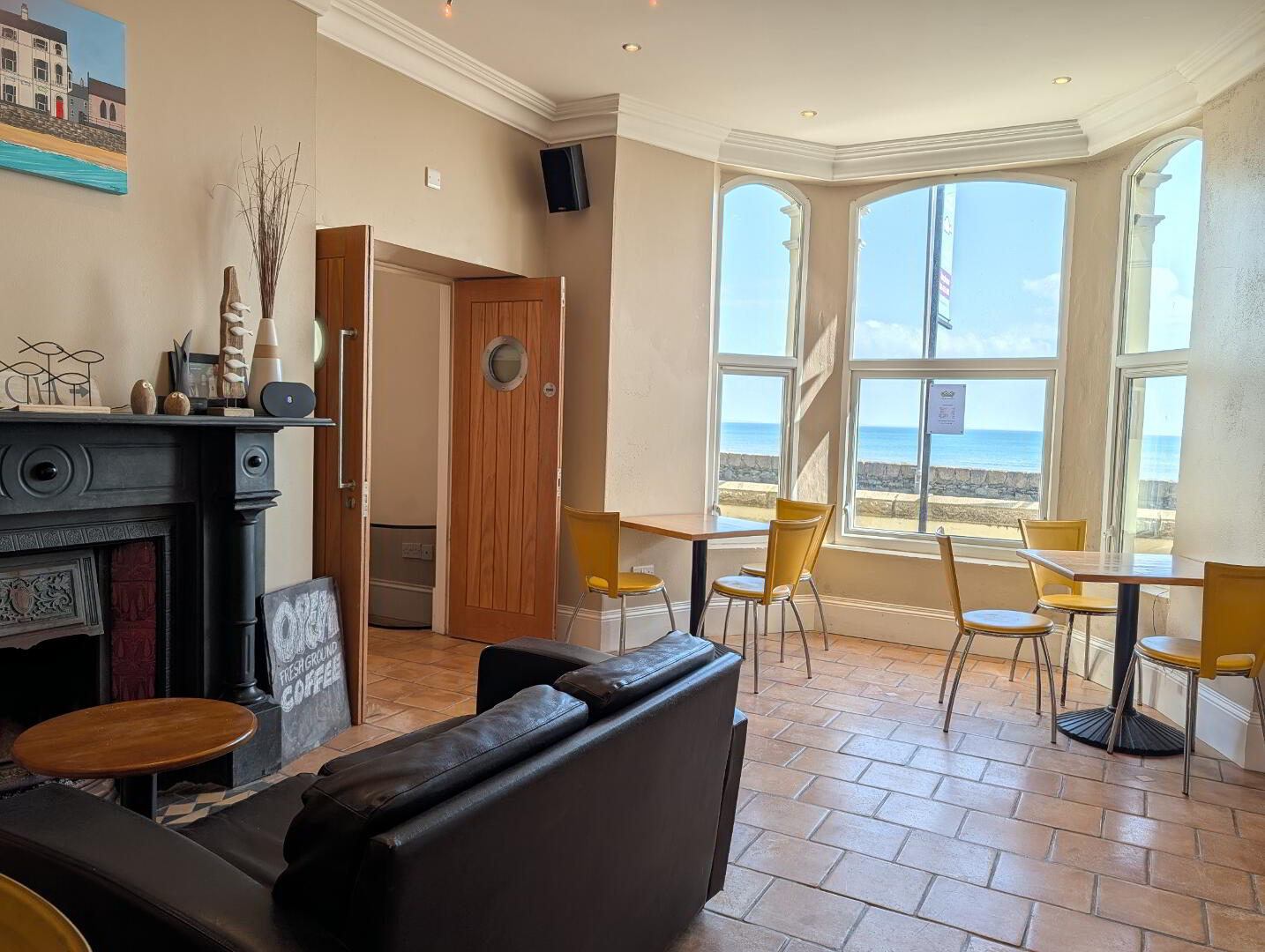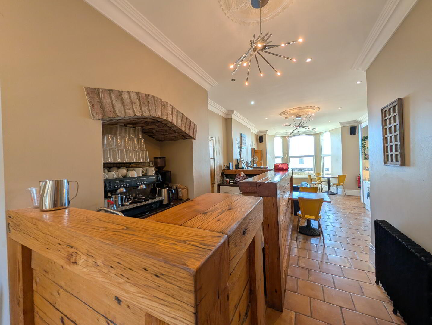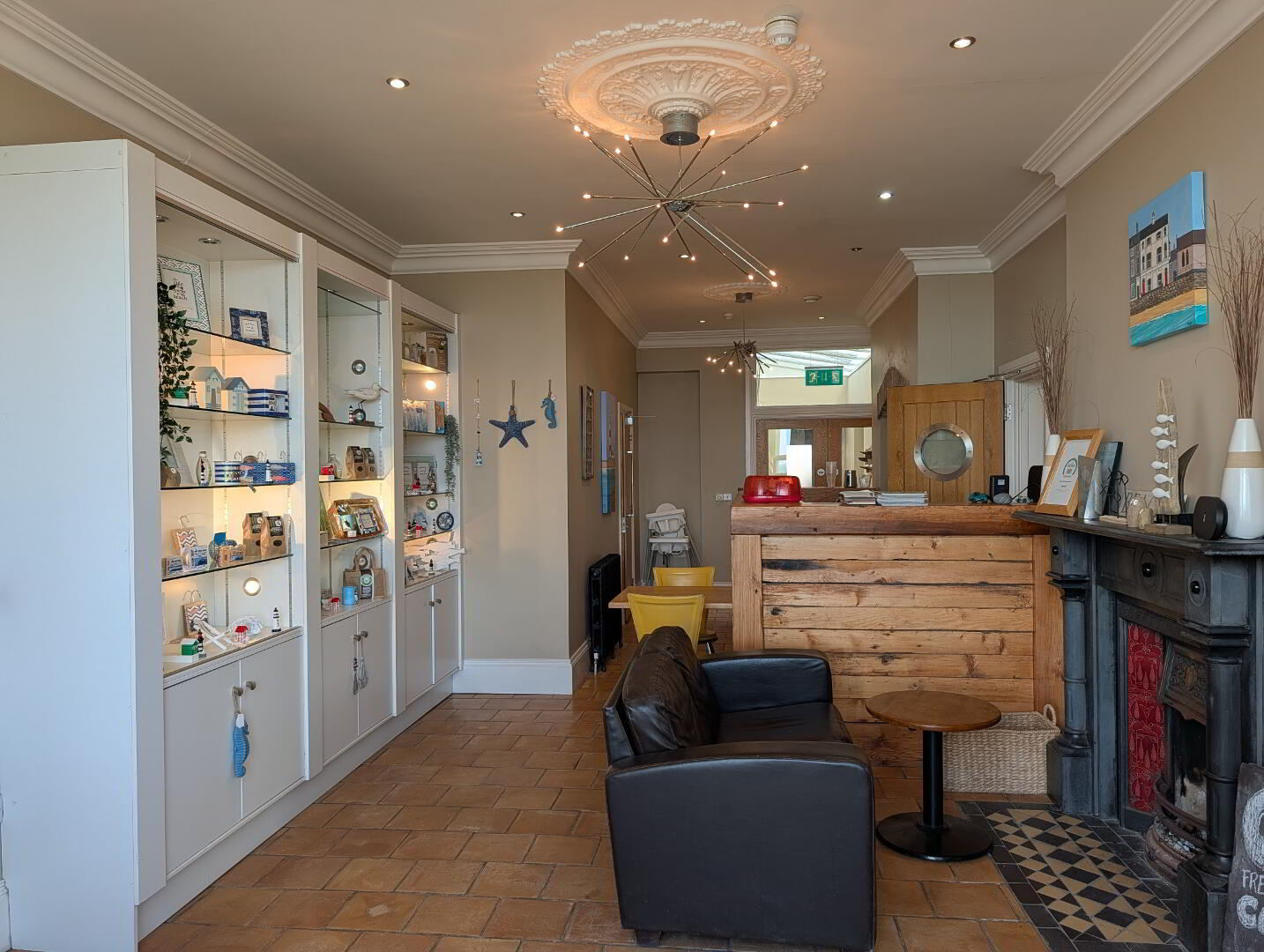 Tile floor, fireplace, reception/coffee bar made hand crafted reclaimed wood, display cabinet with downlighters, recessed spot lighting, glazed double doors opening into tiled hallway and leading off to