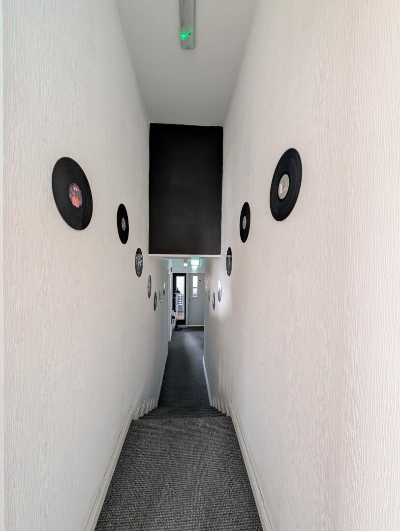 uPVC door with glazed panels opening into communal hallway, carpeted staircase with handrail leading up to…