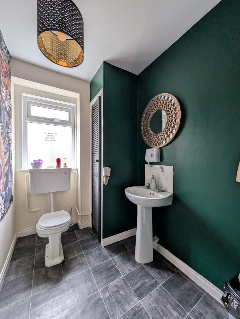 Tile effect floor, low flush W.C., pedestal WHB