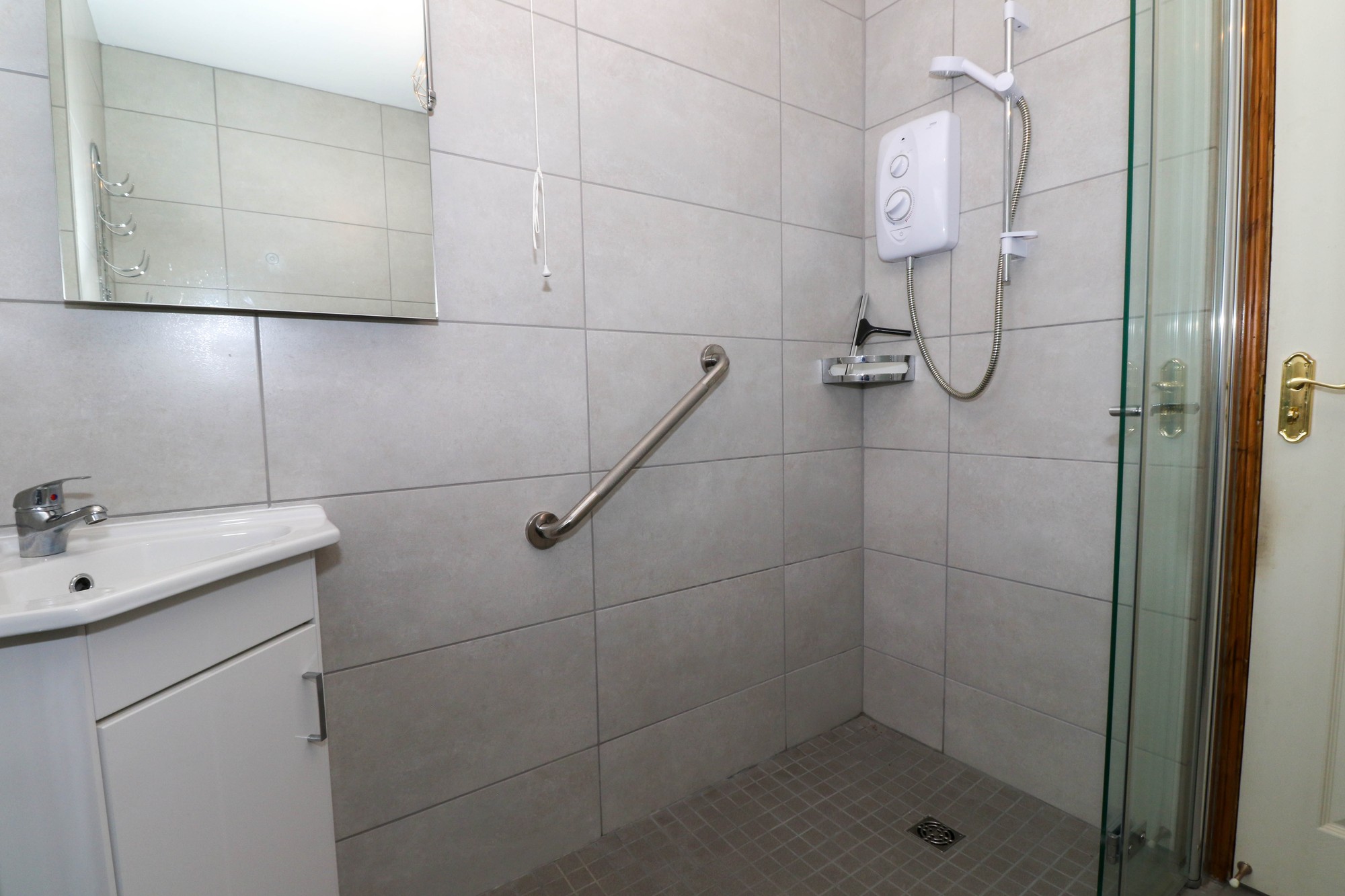 WET ROOM Walk-in shower cubicle with electric unit, vanity unit, WC, fitted wall mirror with lighting, chrome towel heating, tiled walls and flooring.