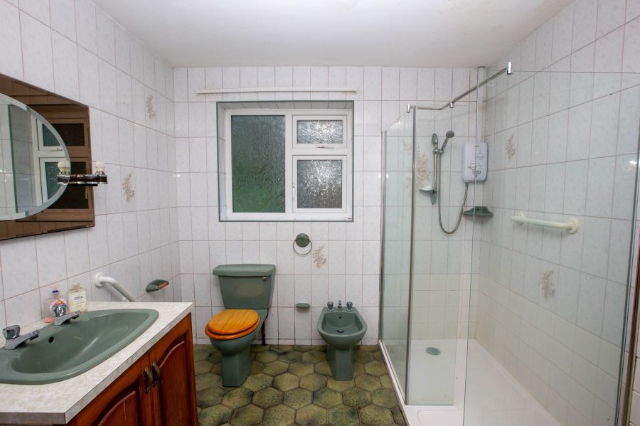 SHOWER ROOM Large shower cubicle with electric unit, vanity unit, wc, bidet, tiled walls and floor, airing cupboard.