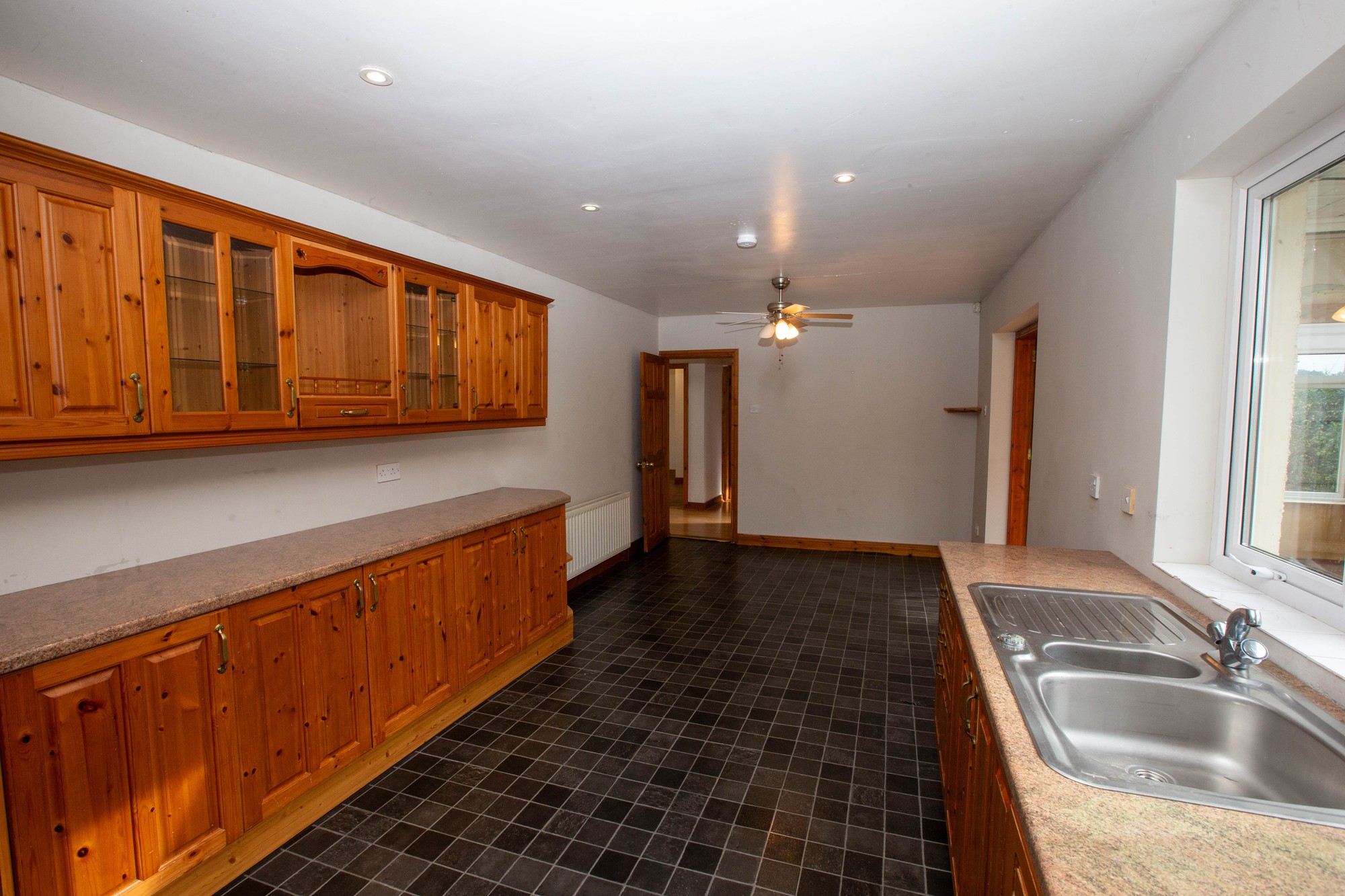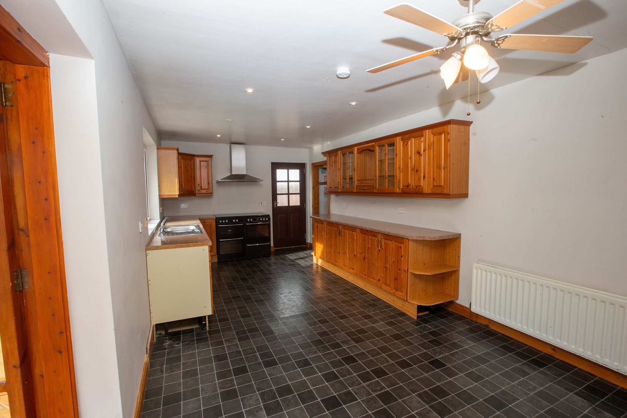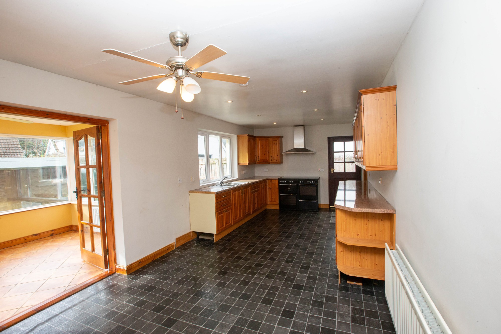 KITCHEN 14’0” x 10’6” (4.27m x 3.2m) -Range of high and low level fitted units, laminate worktops, stainless steel sink unit, range cooker, extractor canopy, integrated dishwasher, mahogany glazed door to side.