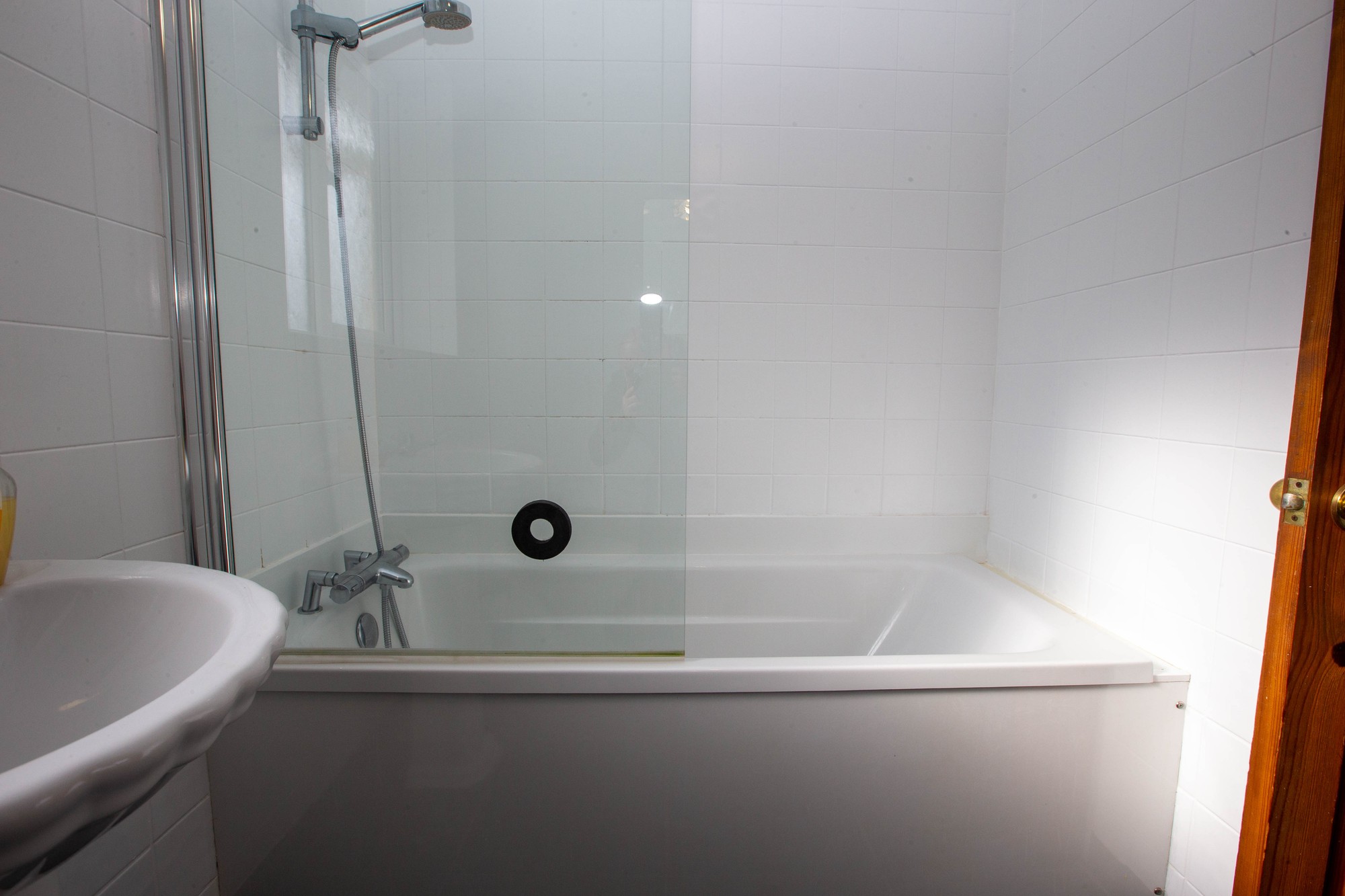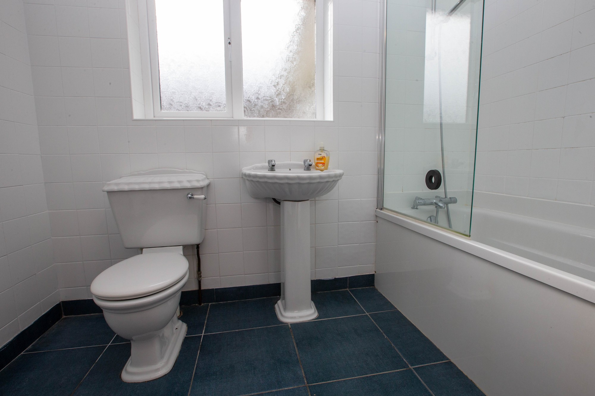 BATHROOM White suite comprising bath with shower unit, wash hand basin and wc, tiled walls and floor, airing cupboard.