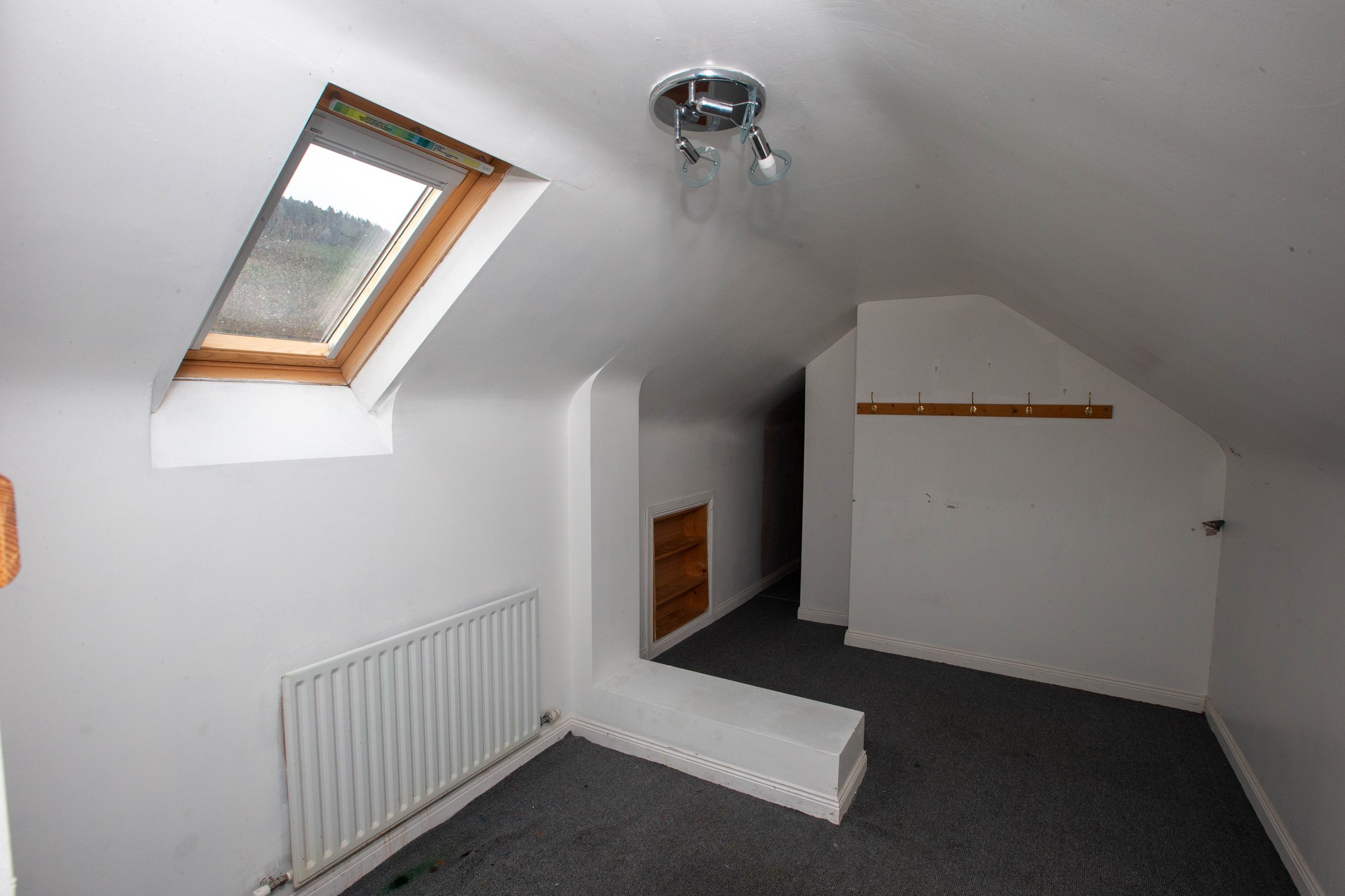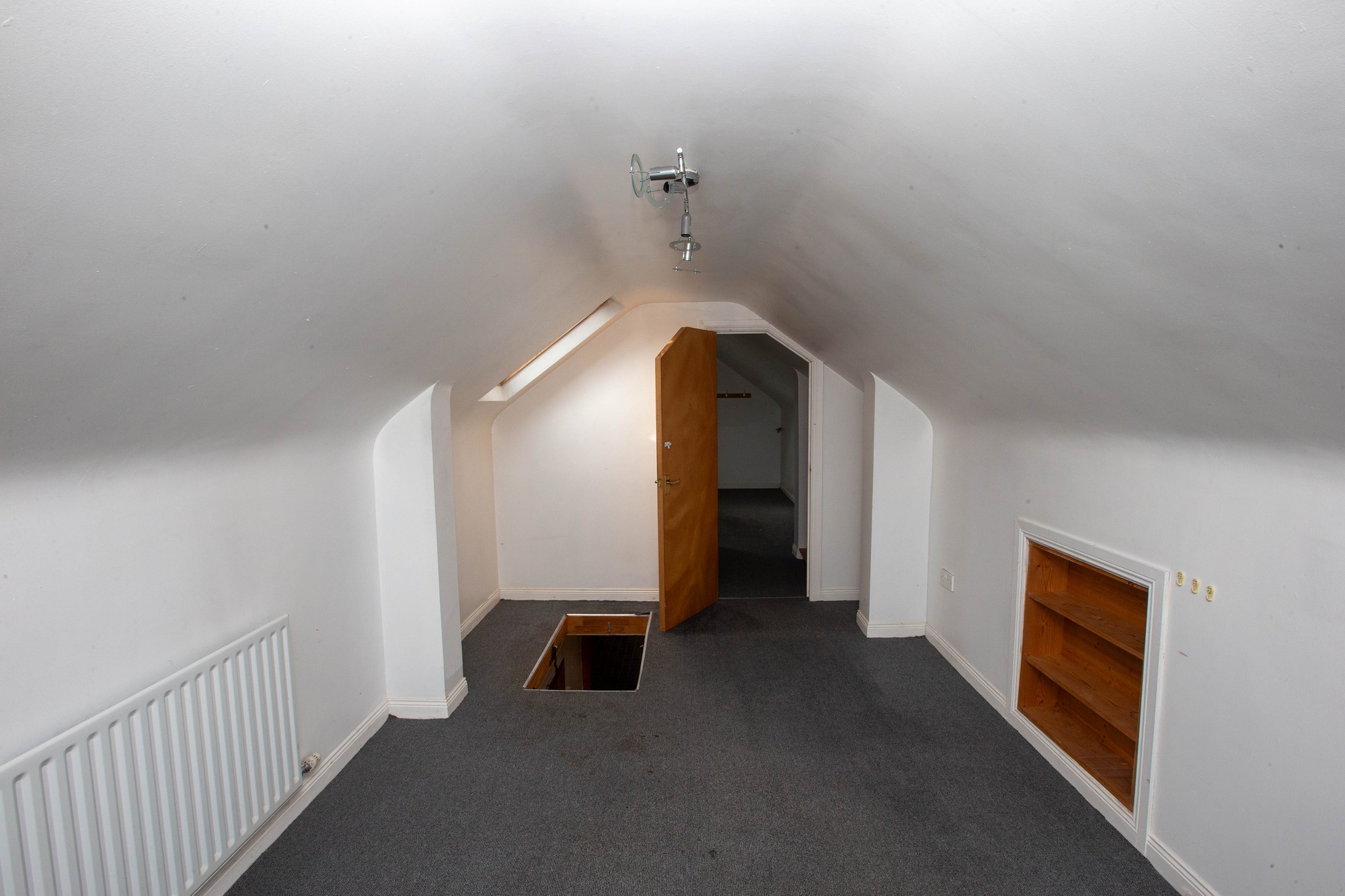 Timber folding ladder to floored roof space providing two storage rooms: