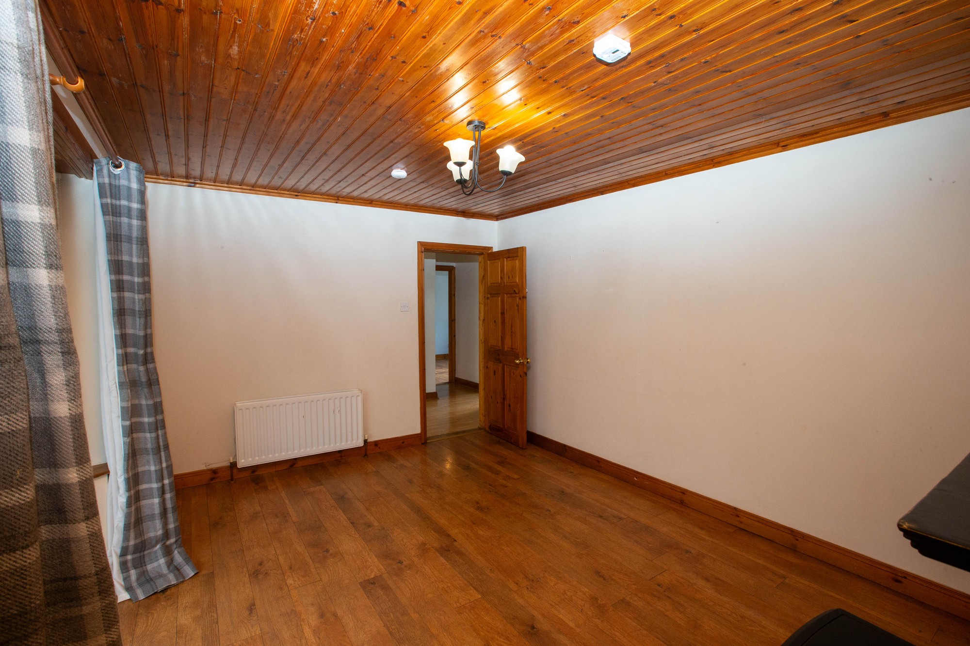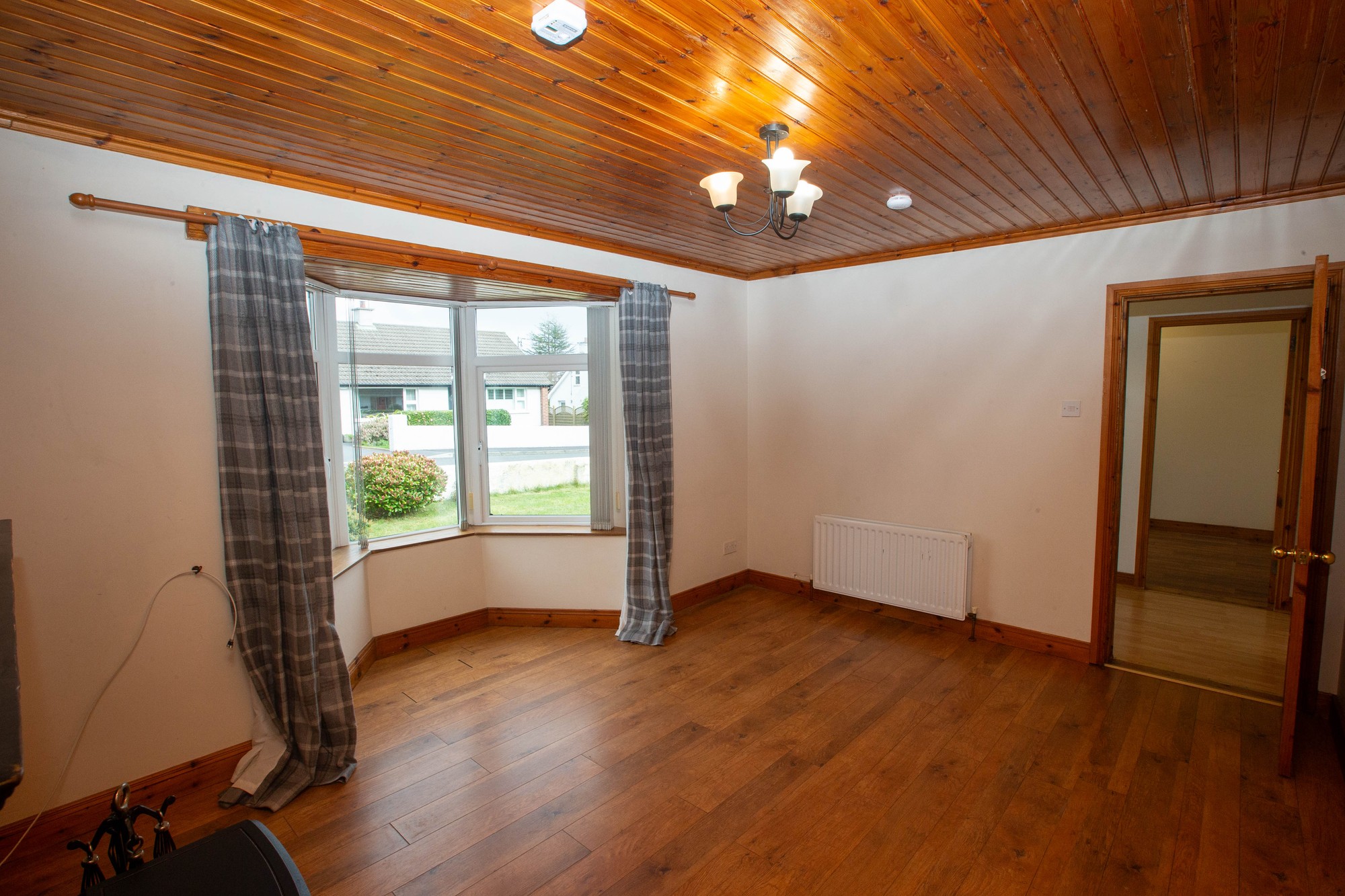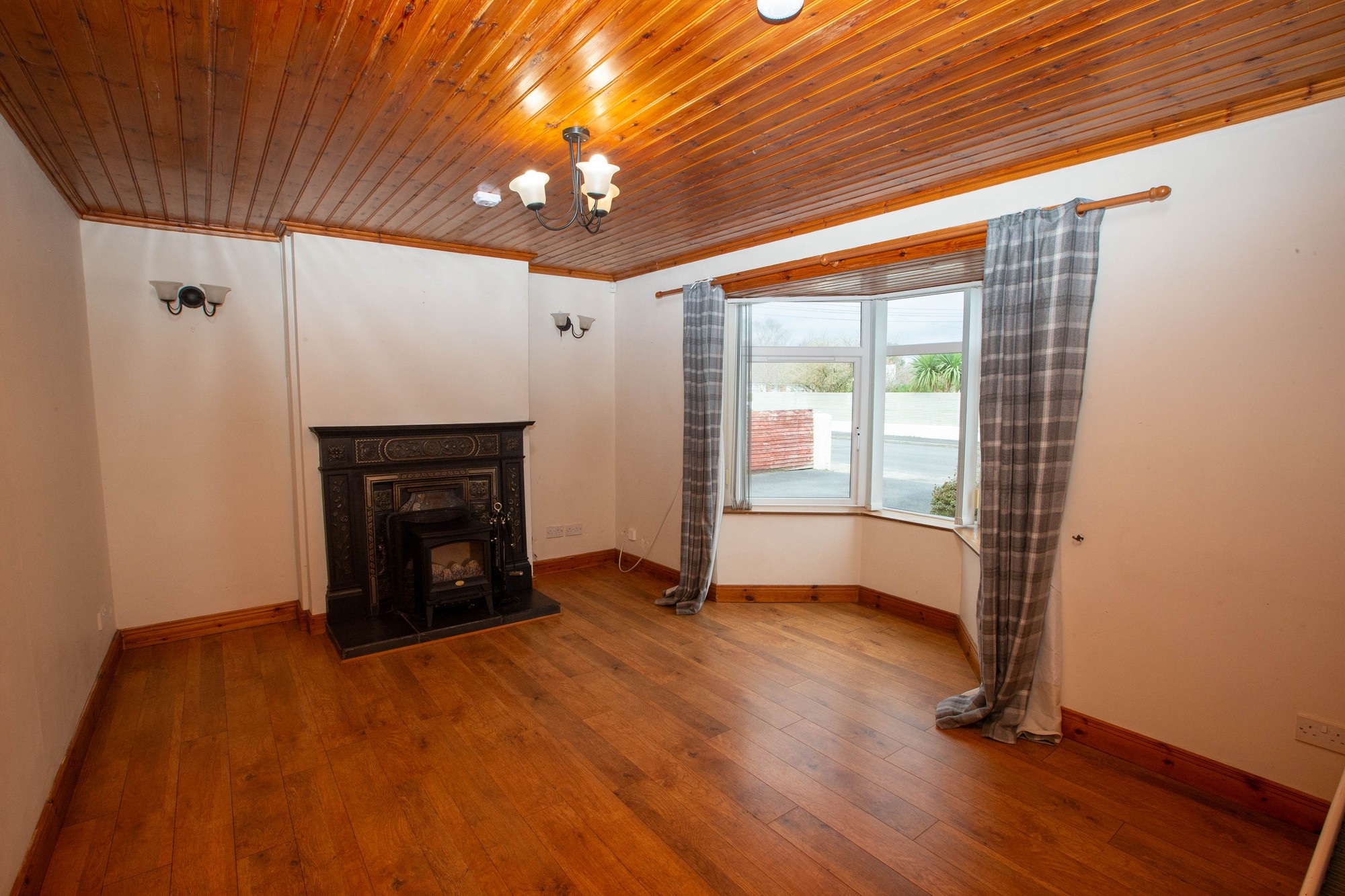 LIVING ROOM 15’0” x 11’0” (4.57m x 3.35m) - Feature cash iron fireplace with slate tiled hearth, laminate wood flooring, bay window, pine clad ceiling.