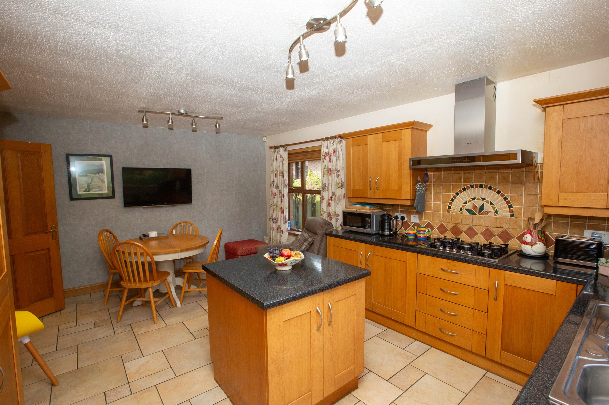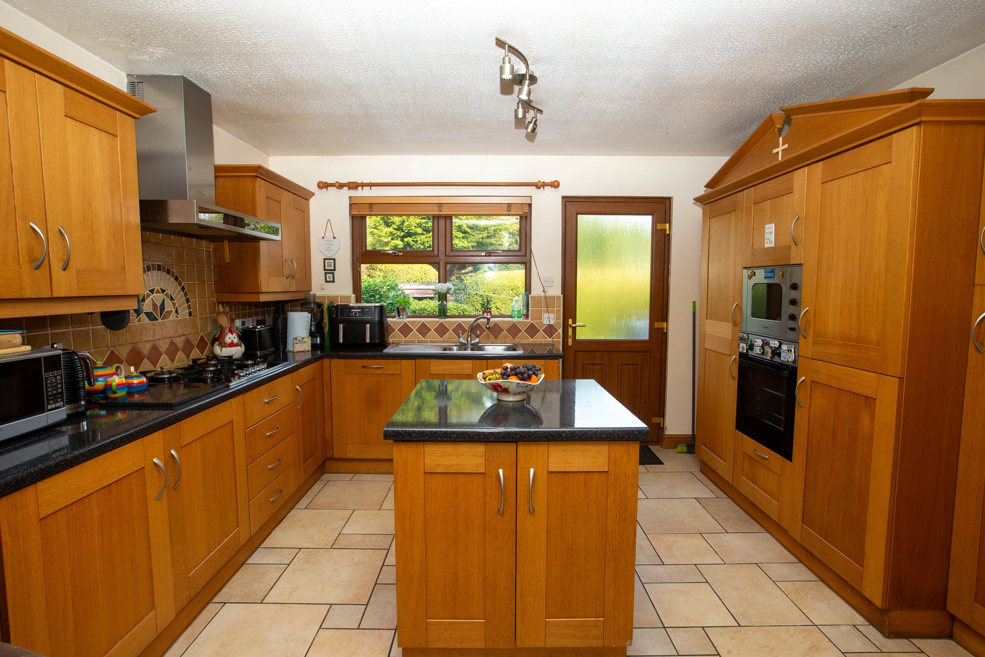 KITCHEN/DINING: 17’6” x 12’10” (5.35m x 3.92m) Extensive range of high and lowlevel fitted units, laminated worktops, island unit, stainless steel sink unit, high level oven, gas hob, extractor canopy, integrated fridge freezer and dishwasher,part tiled walls, tiled floor, spot lights, PVC glazed door to rear.