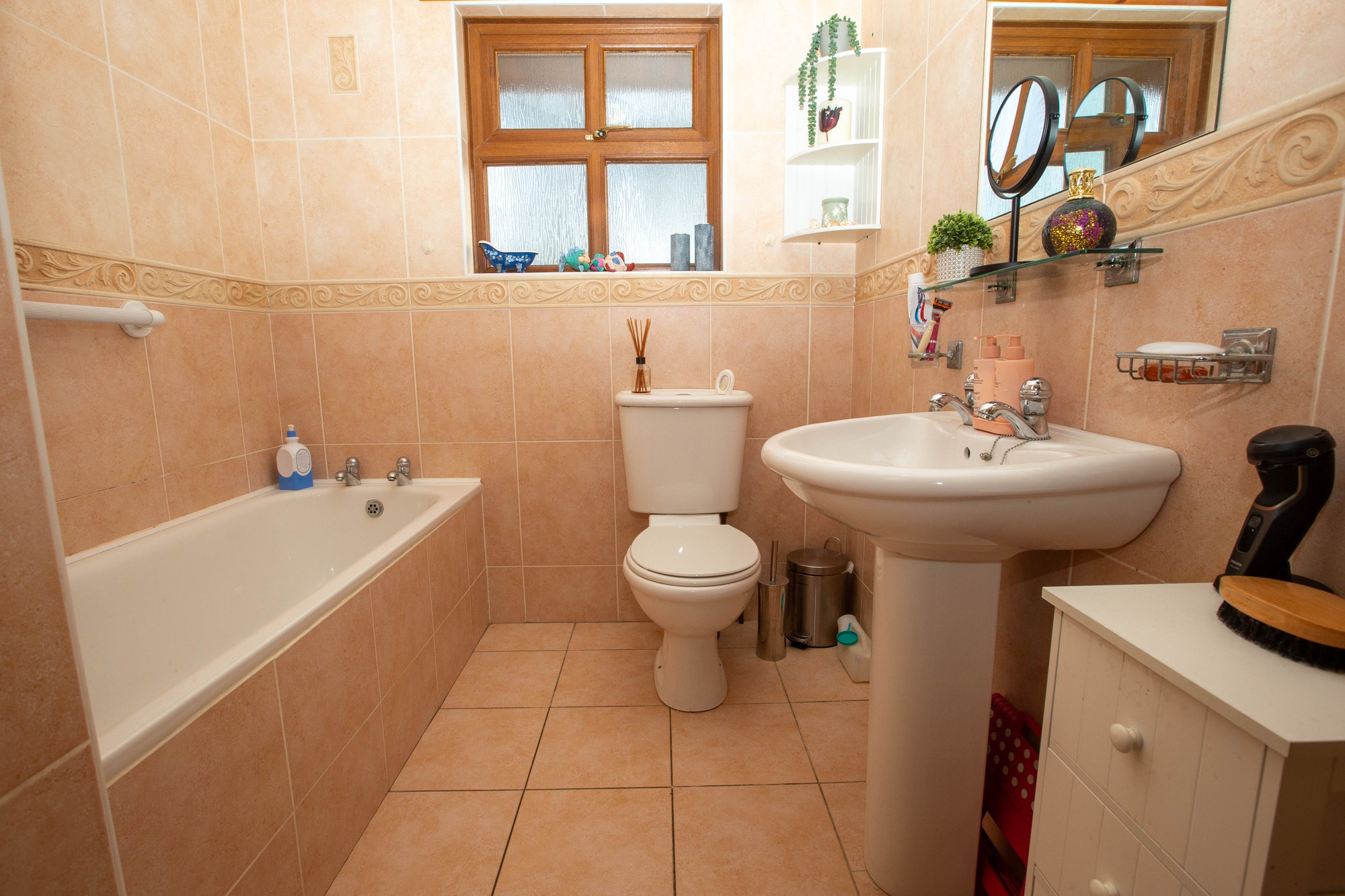 BATHROOM White suite comprising panelled bath with electric shower unit and fitted shower screen, wash-hand basin and wc, fitted wall mirror, fully tiled walls, tiled floor.