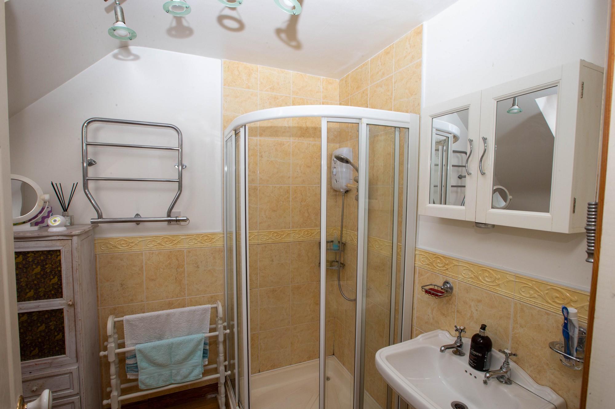En-suite Shower Room Corner shower cubicle with electric unit, wash-hand basin, wc, spot lights, wall cabinet, part tiled walls, wood laminate flooring.