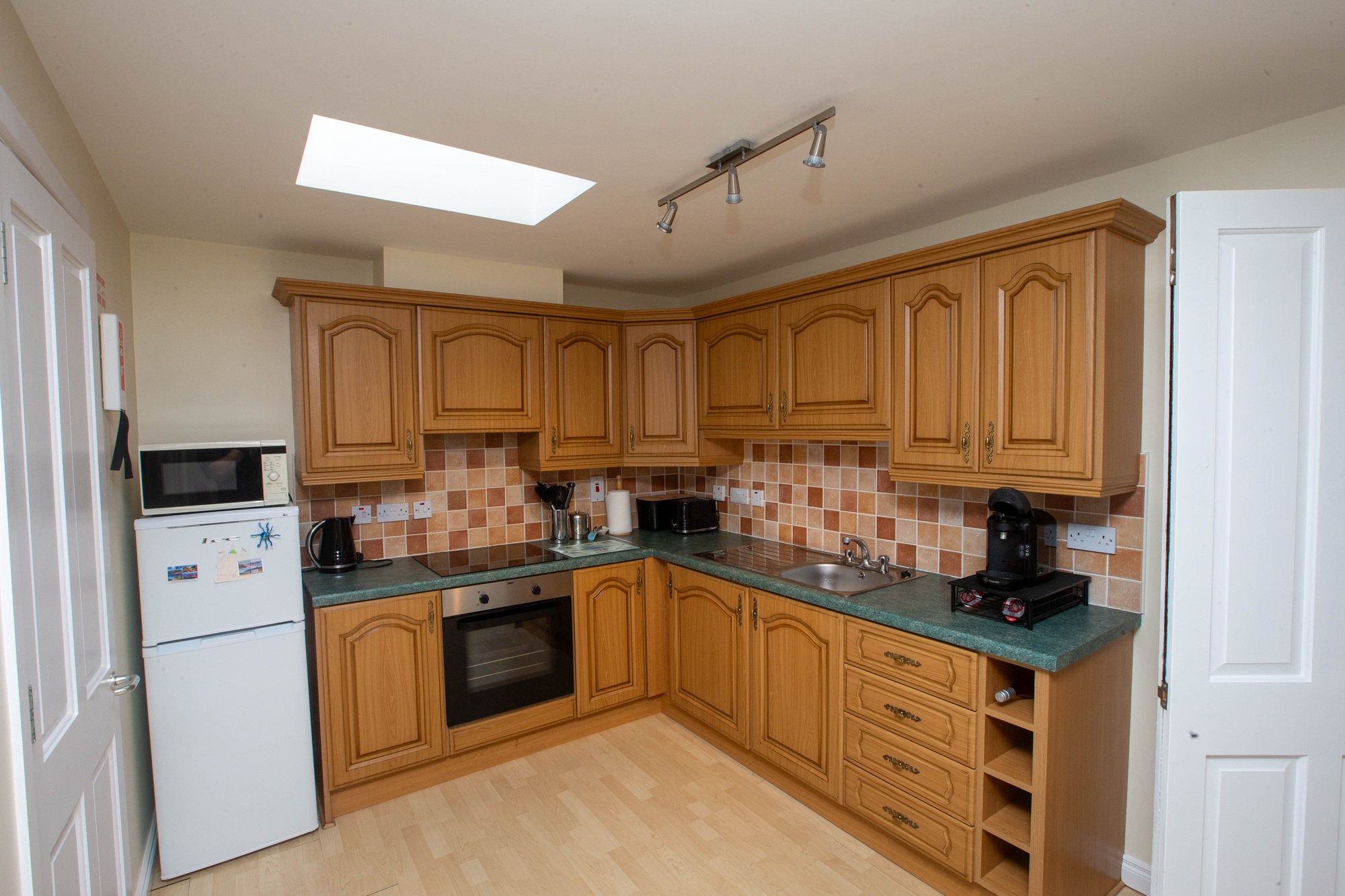 KITCHEN: 11’0” x 8’8” (3.35m x 2.64m) - Range of high and low level fitted units, laminated worktops, stainless steel sink unit, integrated oven and ceramic hob, extractor canopy, storage cupboard, part tiled walls, laminate wood flooring.