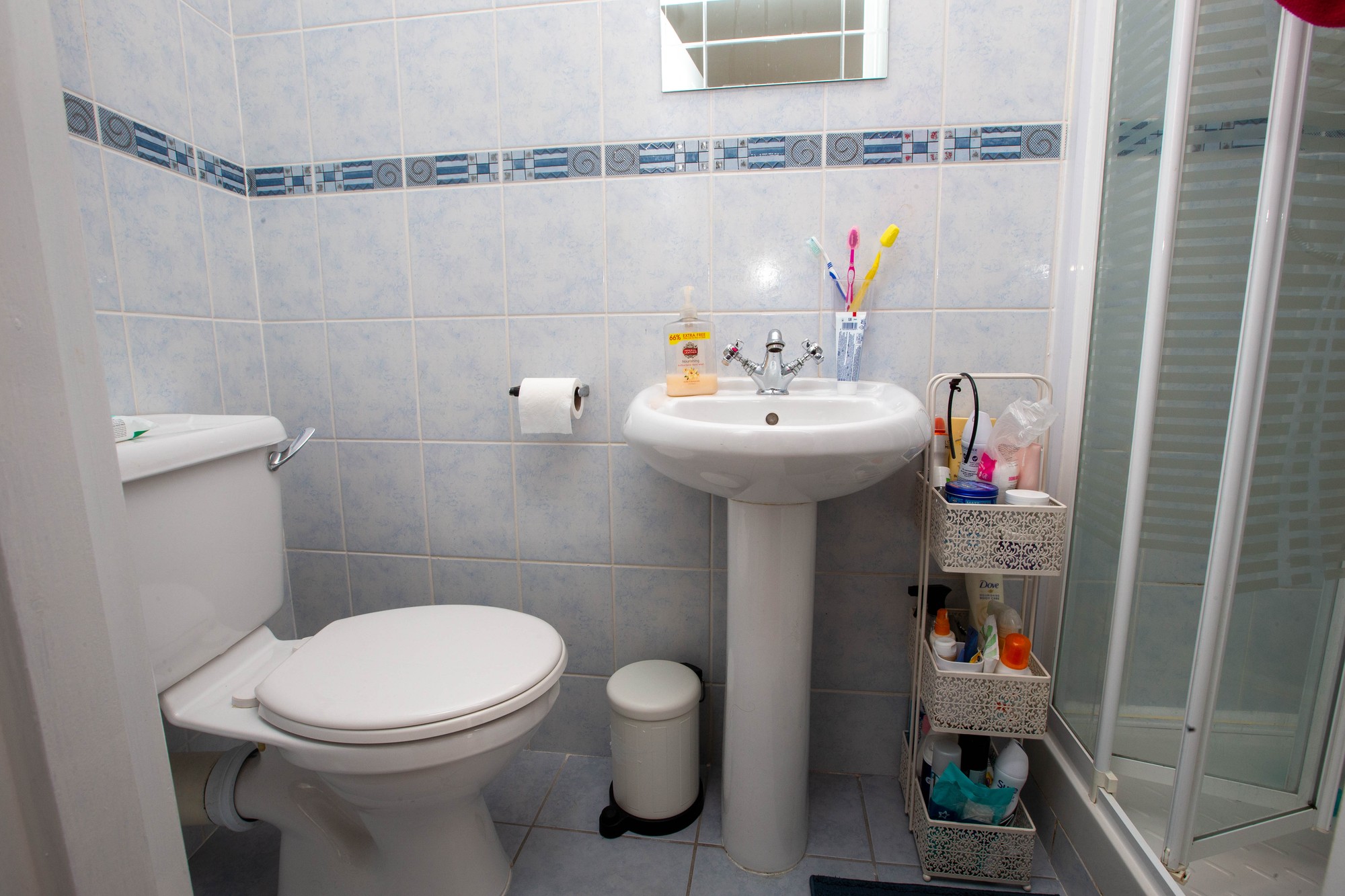En-Suite Shower Room: Shower cubicle with electric unit, wash hand basin, wc, fitted wall mirror, tiled walls and floor.