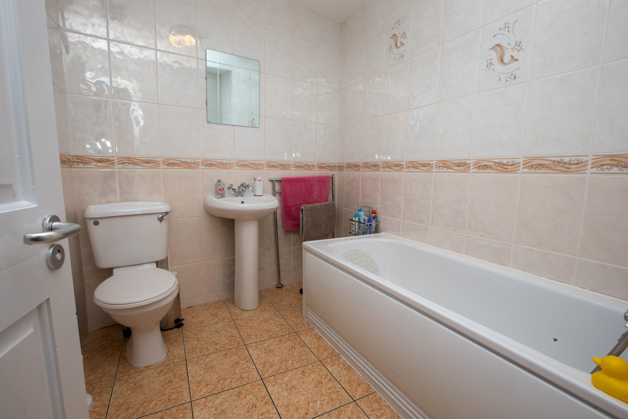 BATHROOM: White suite comprising panelled bath with telephone shower, wash hand basin and wc, tiled walls and floor.