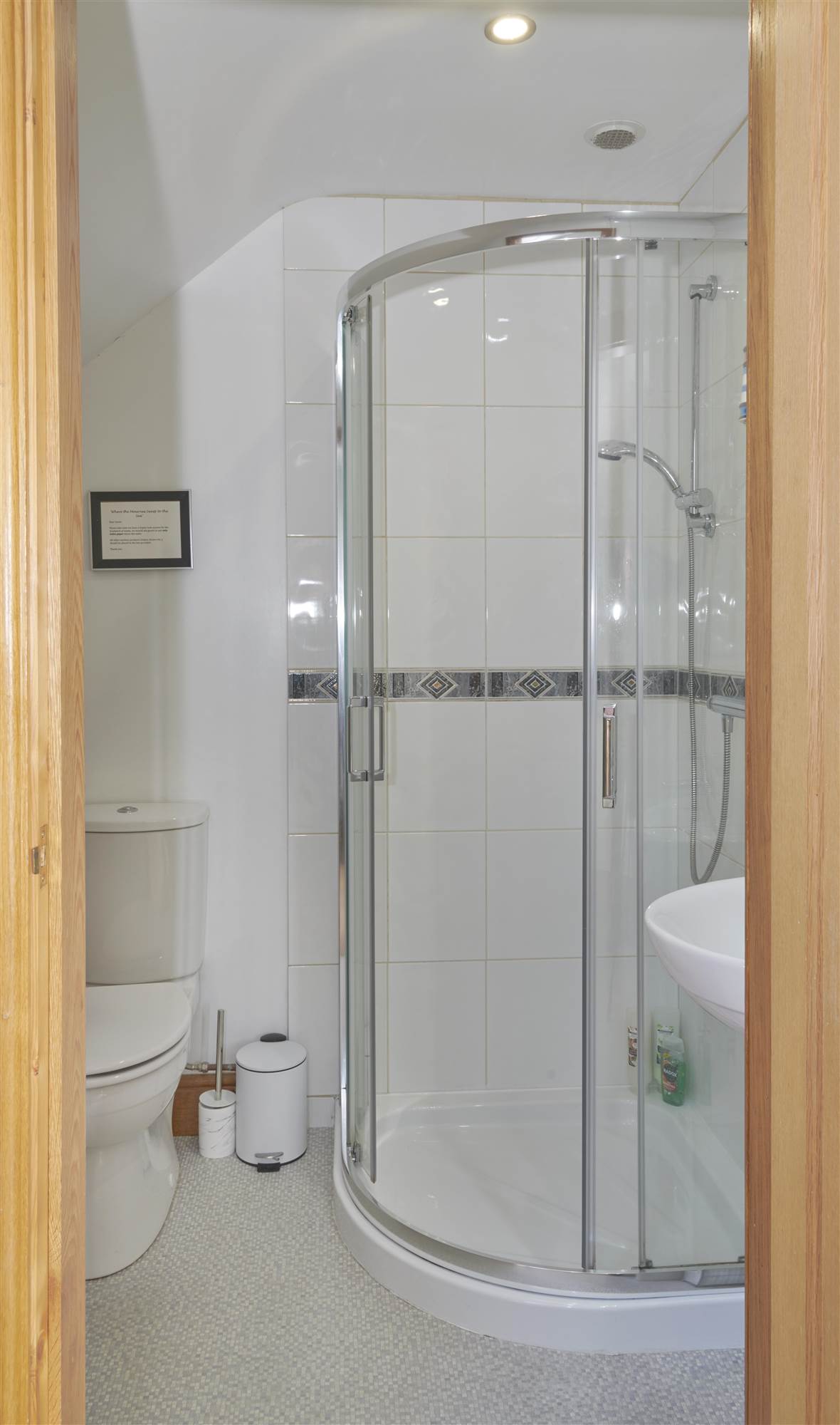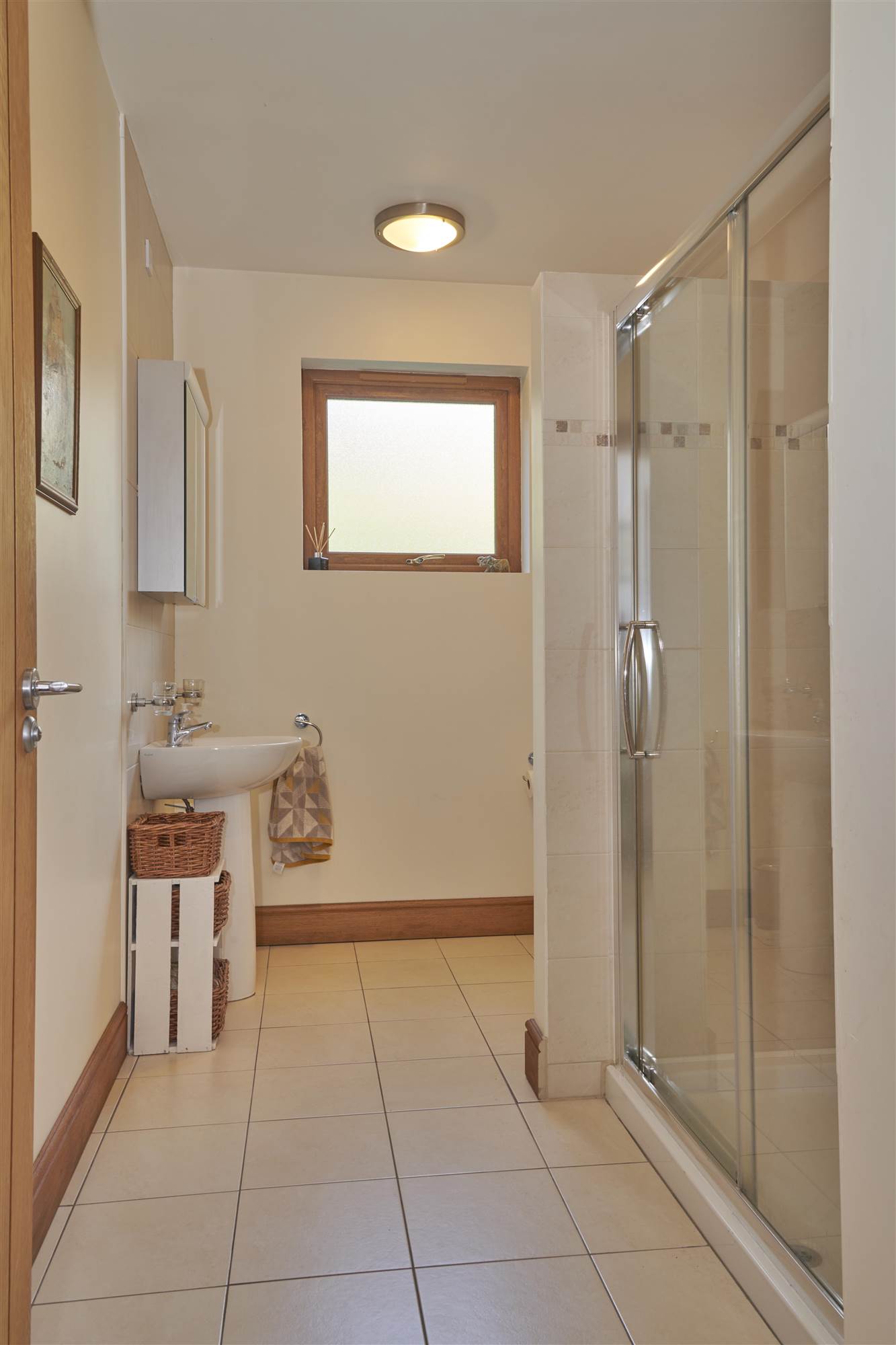 Fully Tiled Shower Enclosure, low flush WC, wash hand basin.
