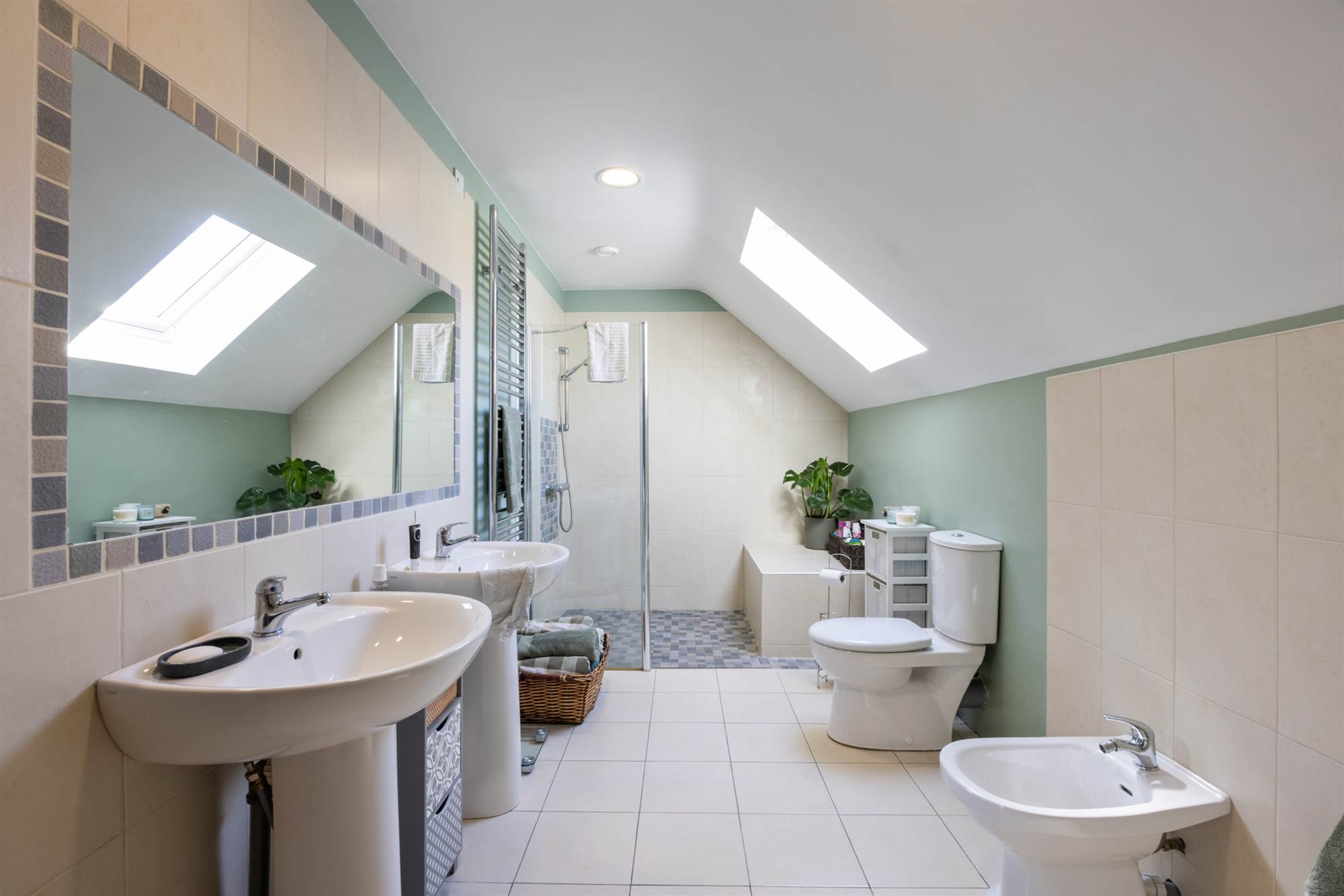 White suite, panelled bath, mixer taps, walk in shower enclosure, low flush WC, twin wash hand basin, bedet