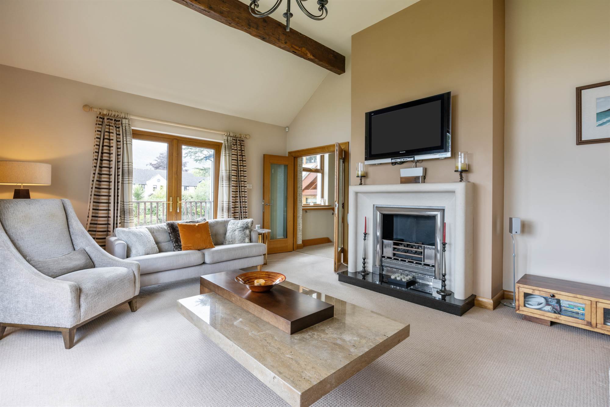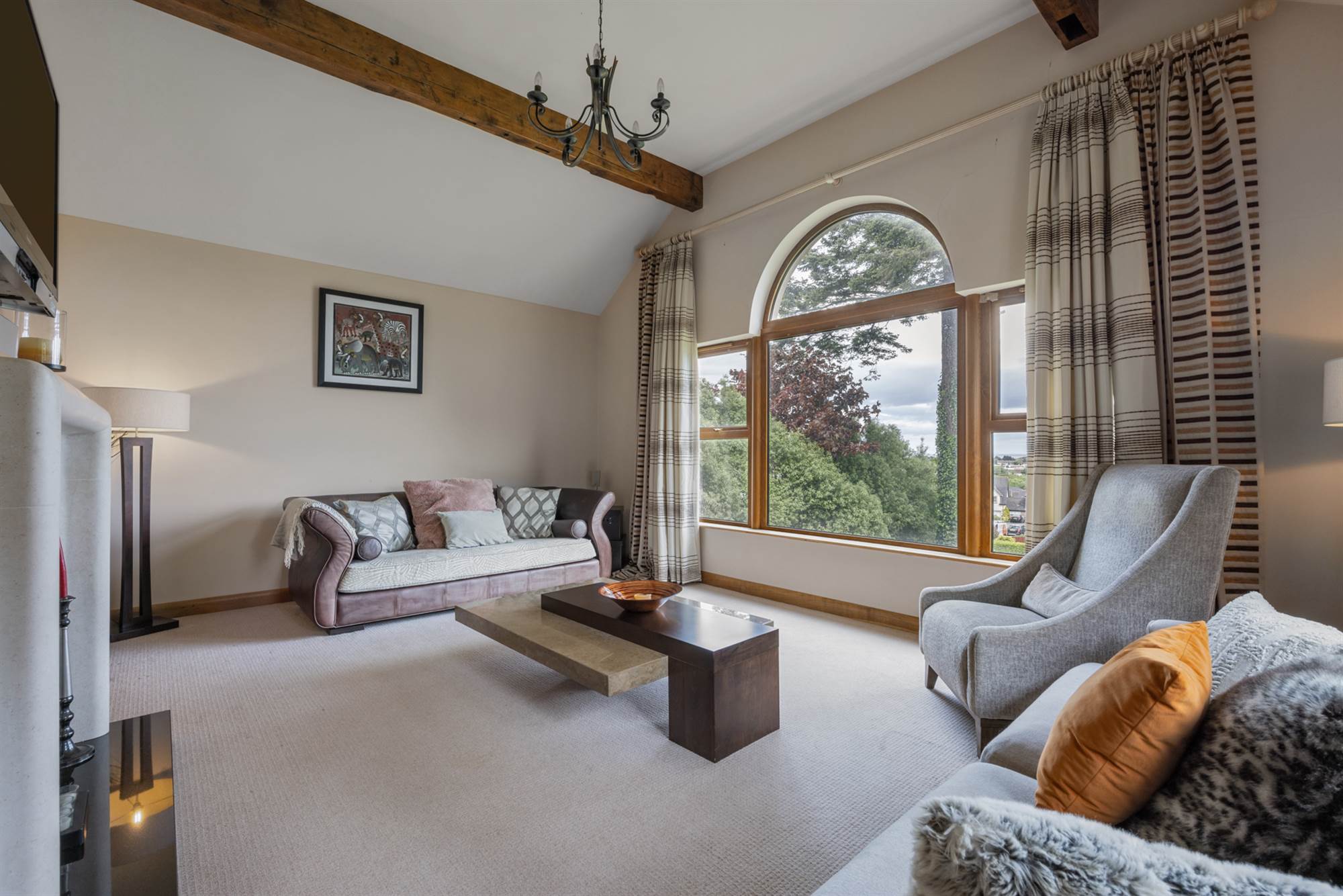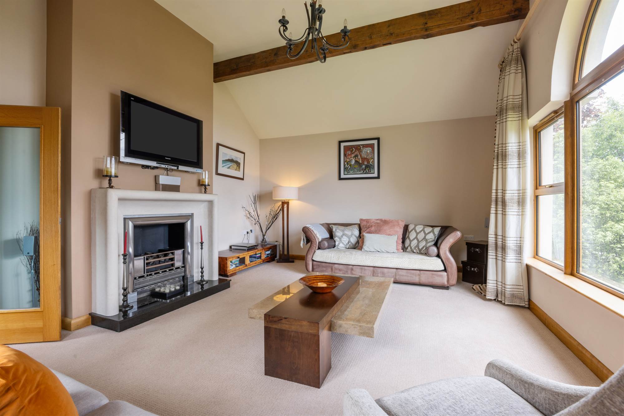 Limestone Fireplace with gas fire, feature natural wooden ceiling beams, access to patio/terrace with views of Mourne Mountains.