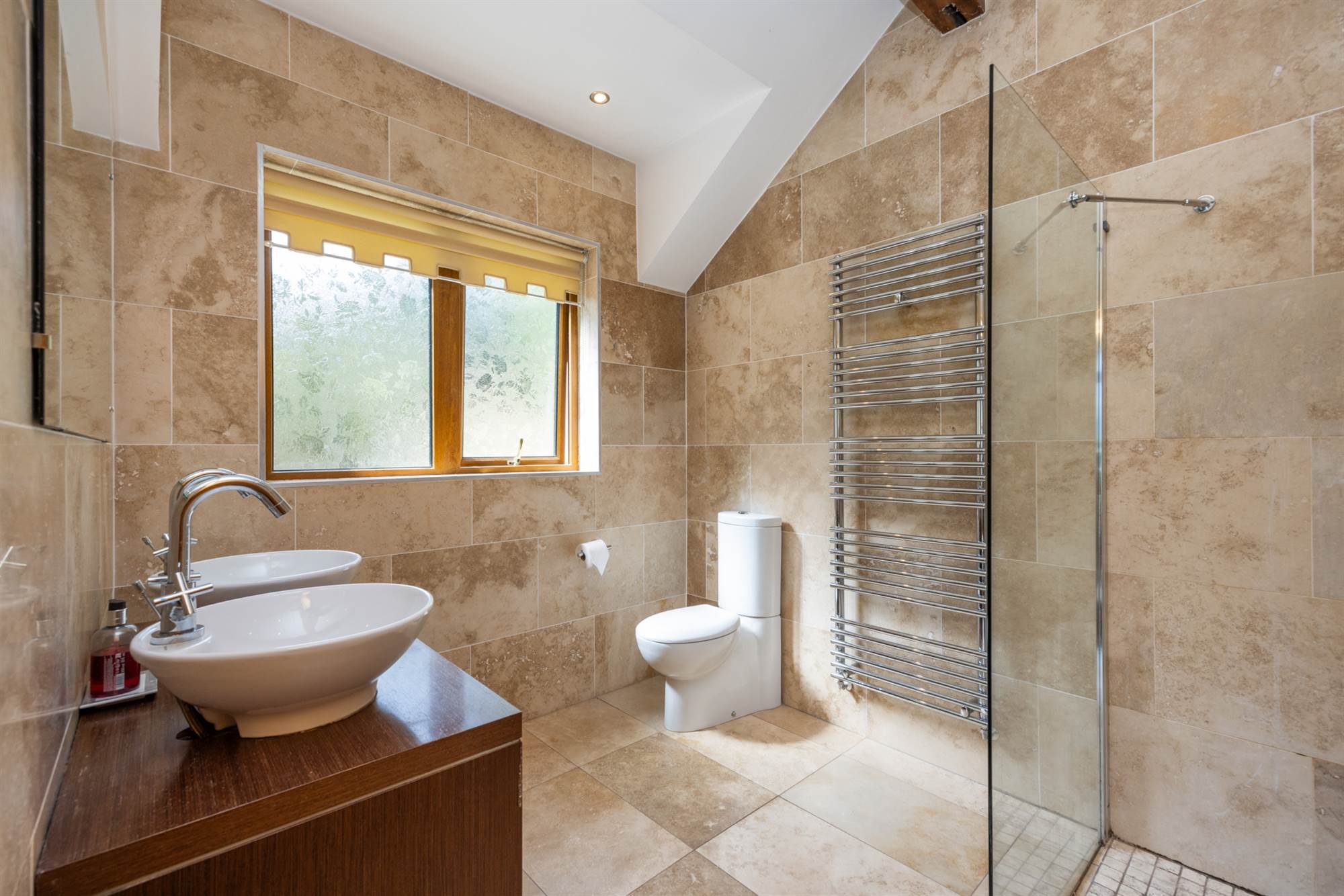 Walk in Shower Enclosure, low flush WC, twin wash hand basin with vanity unit, fully tiled walls and floor, heated towel rail, feature natural wooden ceiling beams.
