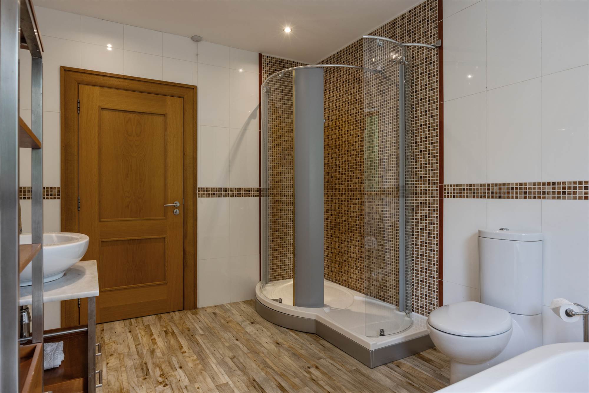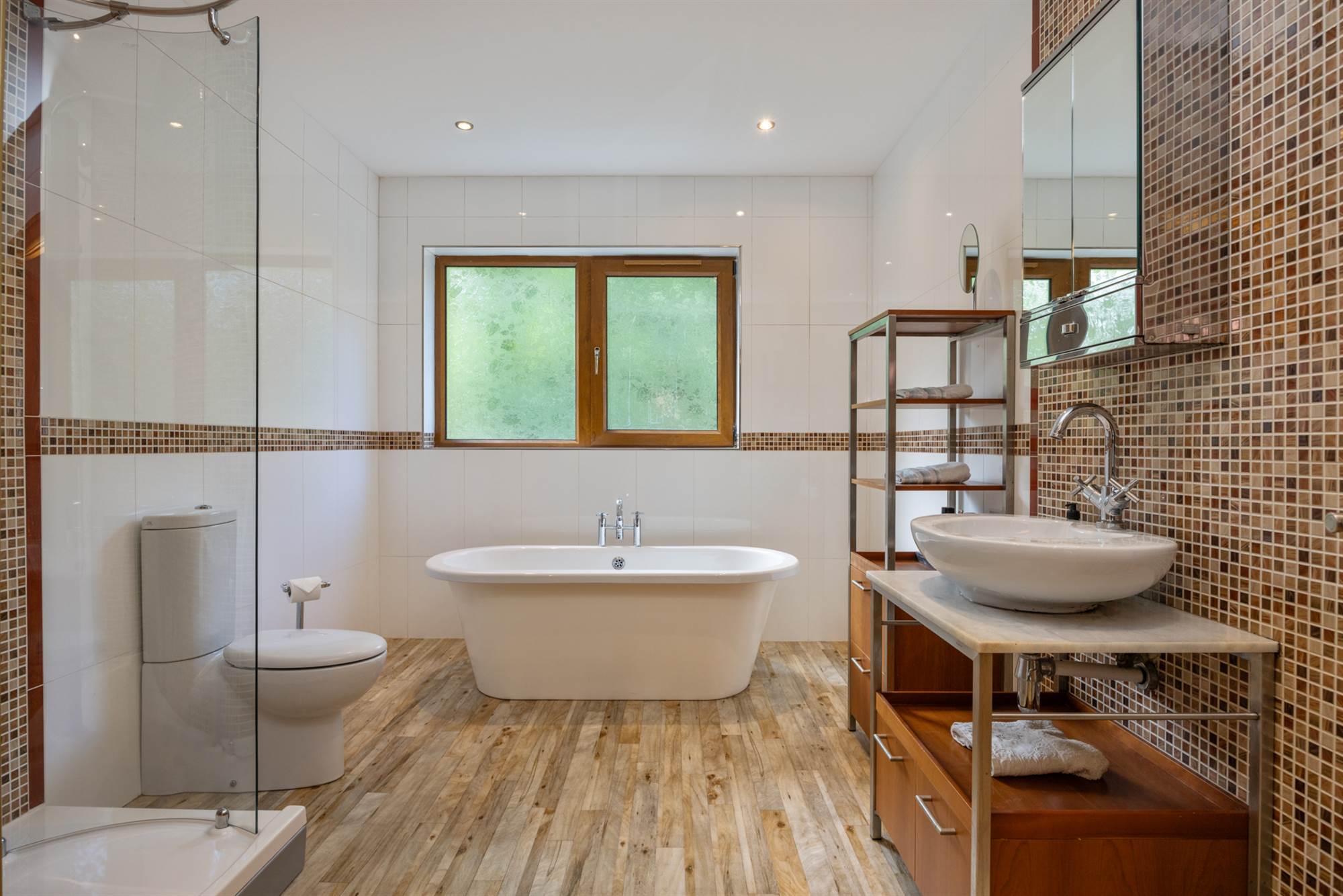 Free standing bath, mixer taps, telephone hand shower, large walk in shower enclosure, low flush WC, wash hand basin with vanity unit, Amtico floor tiling.