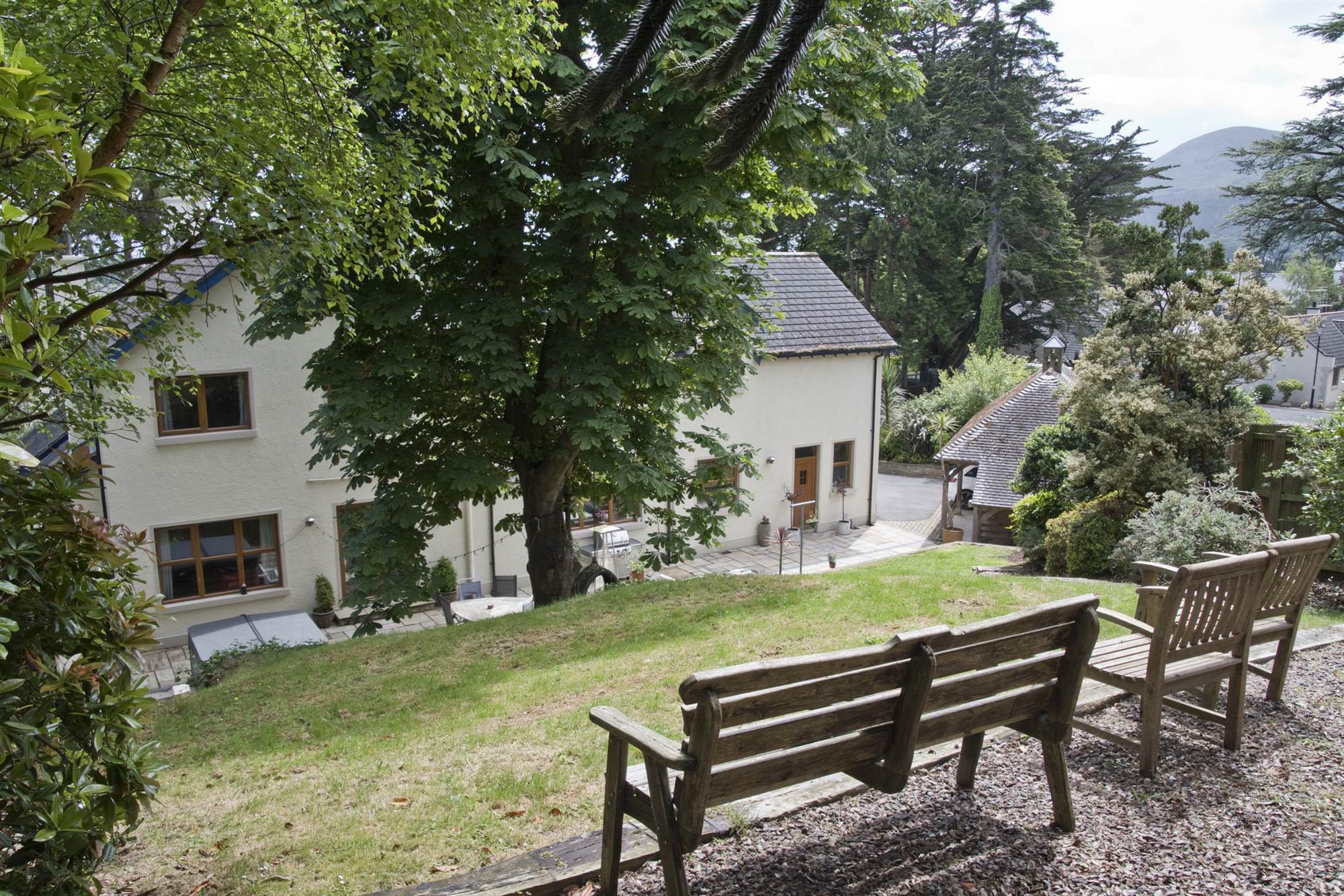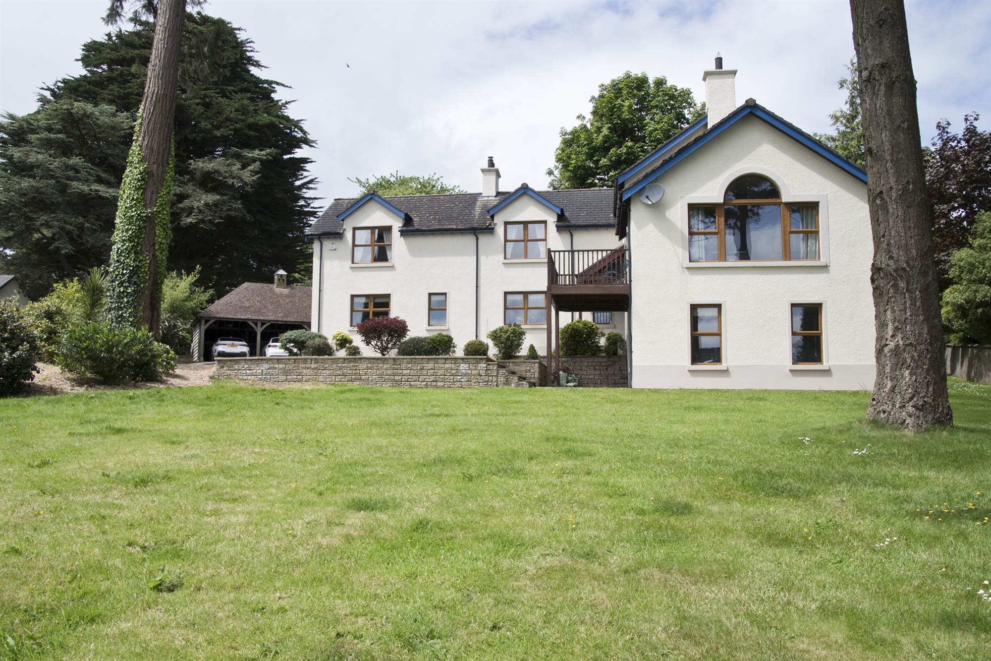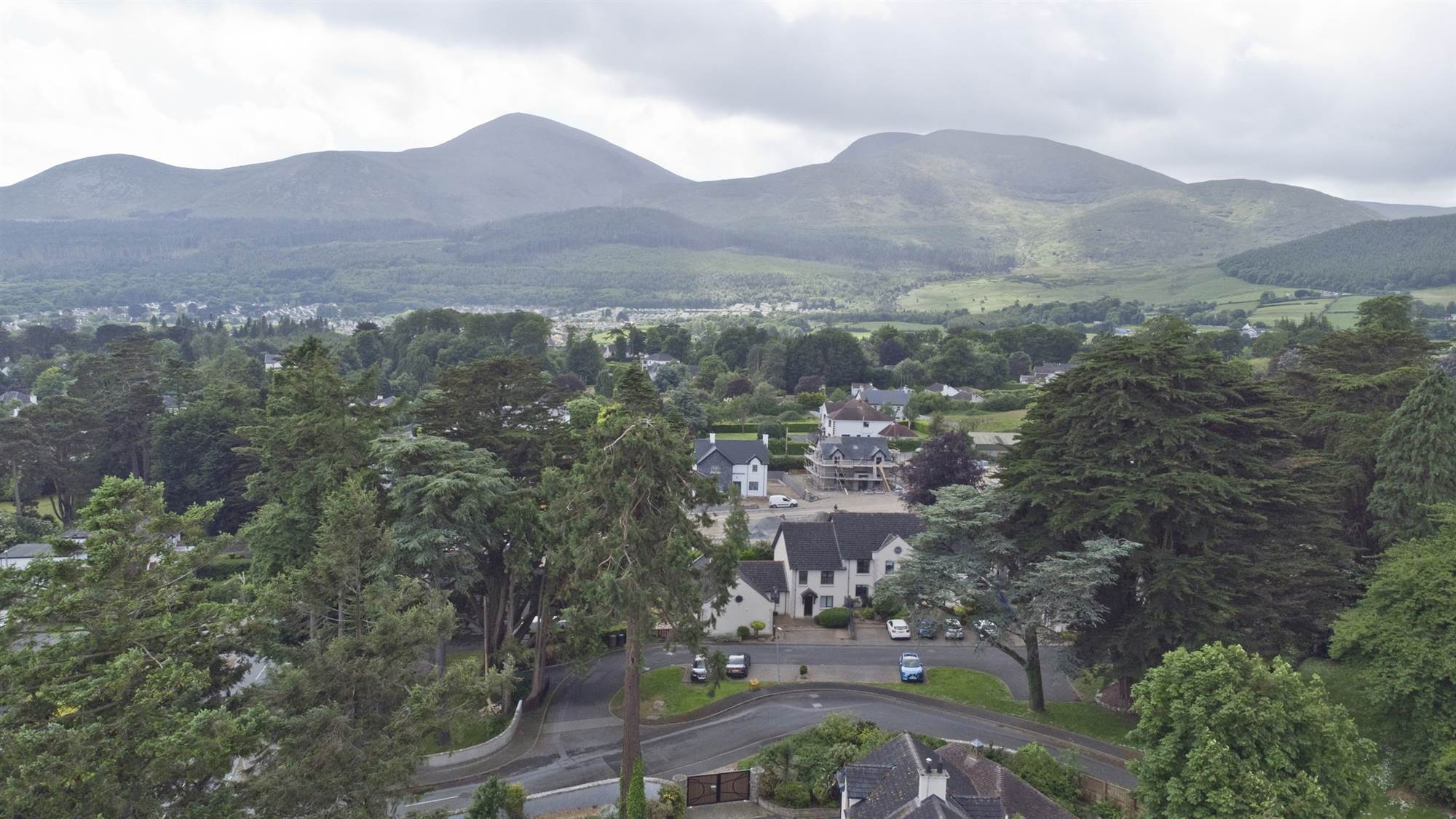 Generous site with large gardens, lawns, mature trees, electric gates, generous parking, carport and garden store, panoramic views of Sea and Mourne Mountains. Stone boundary wall.