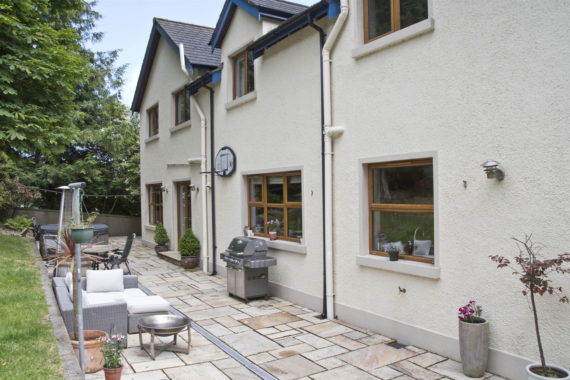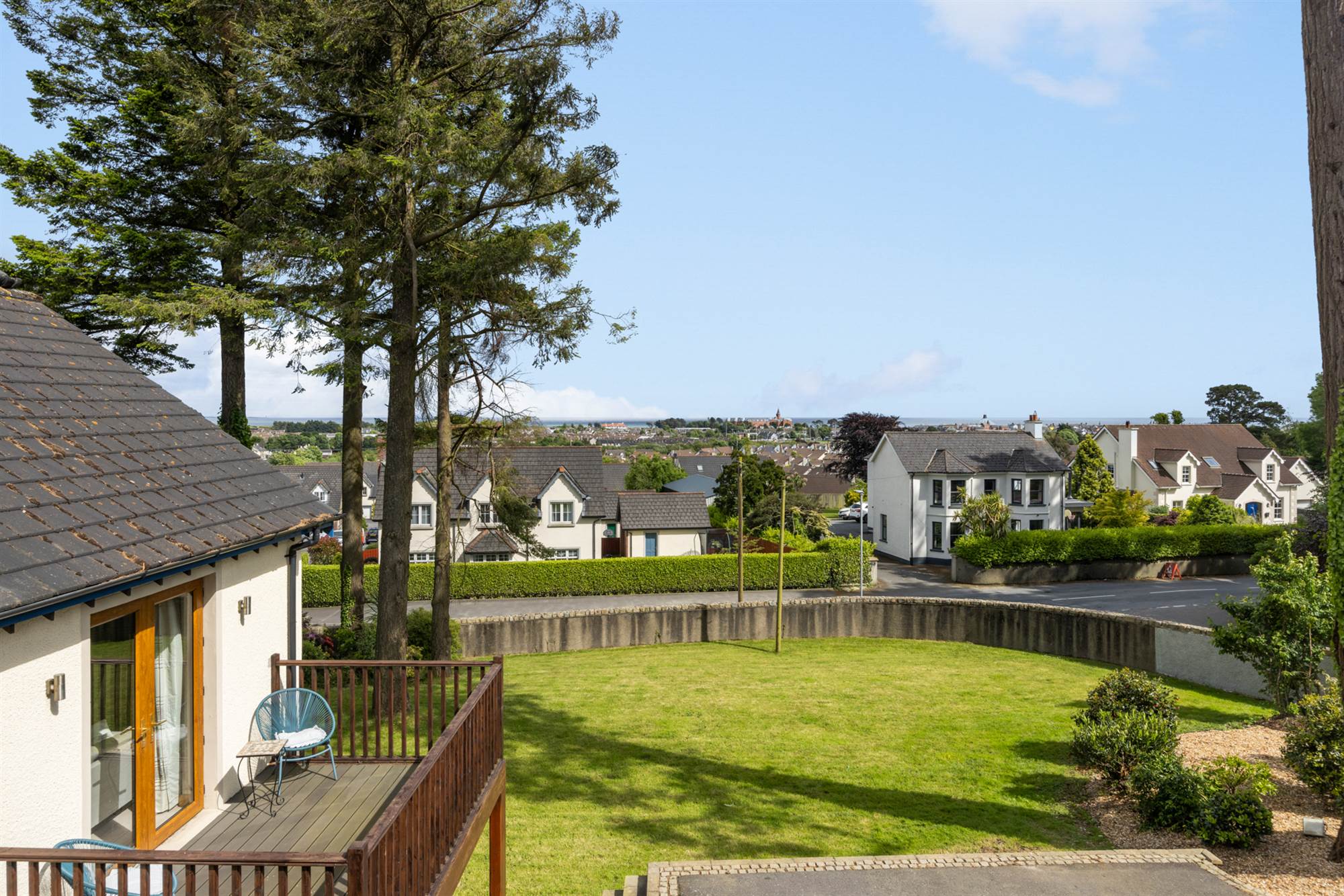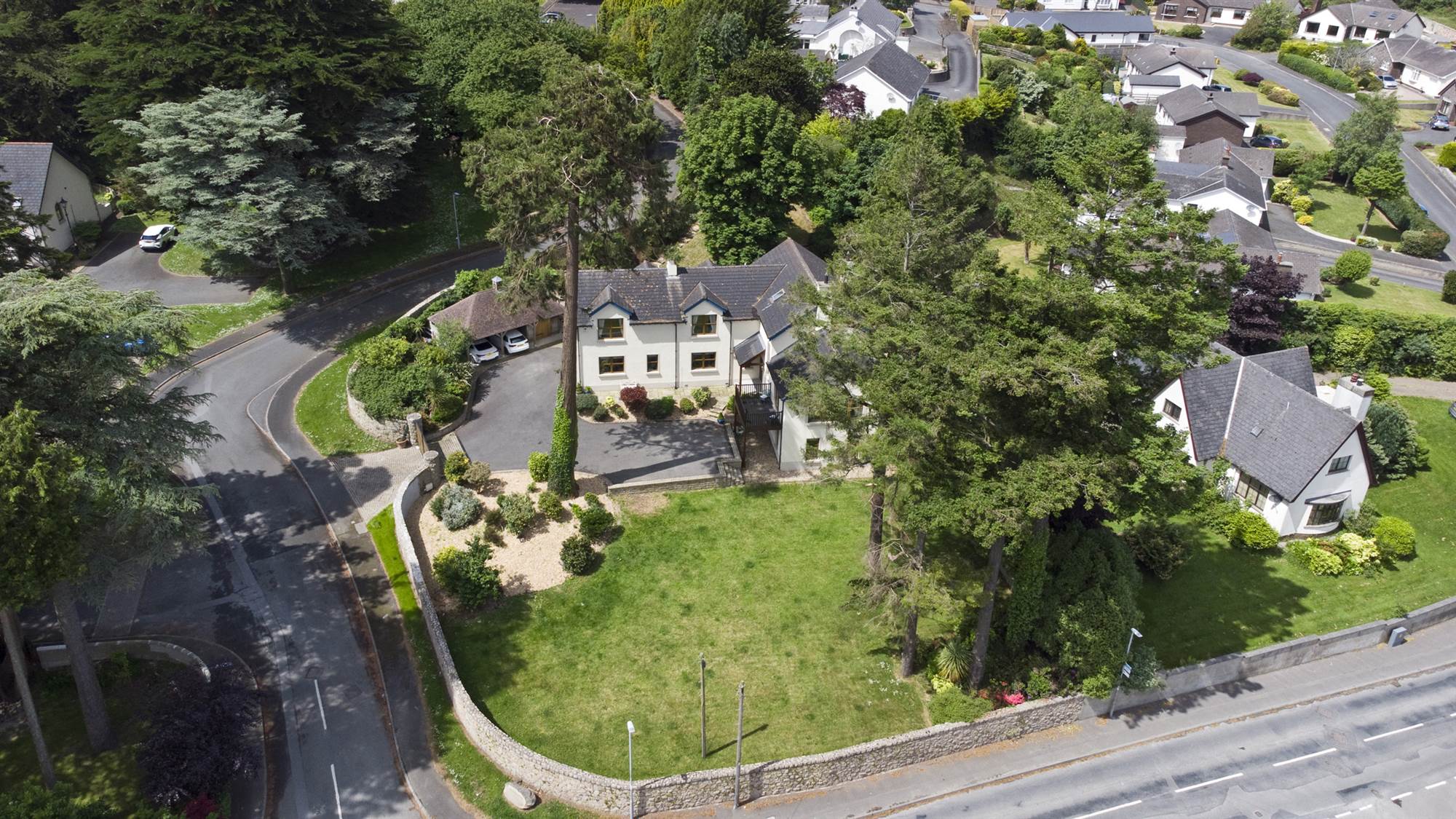 Generous site with large gardens, lawns, mature trees, electric gates, generous parking, carport and garden store, panoramic views of Sea and Mourne Mountains. Stone boundary wall.