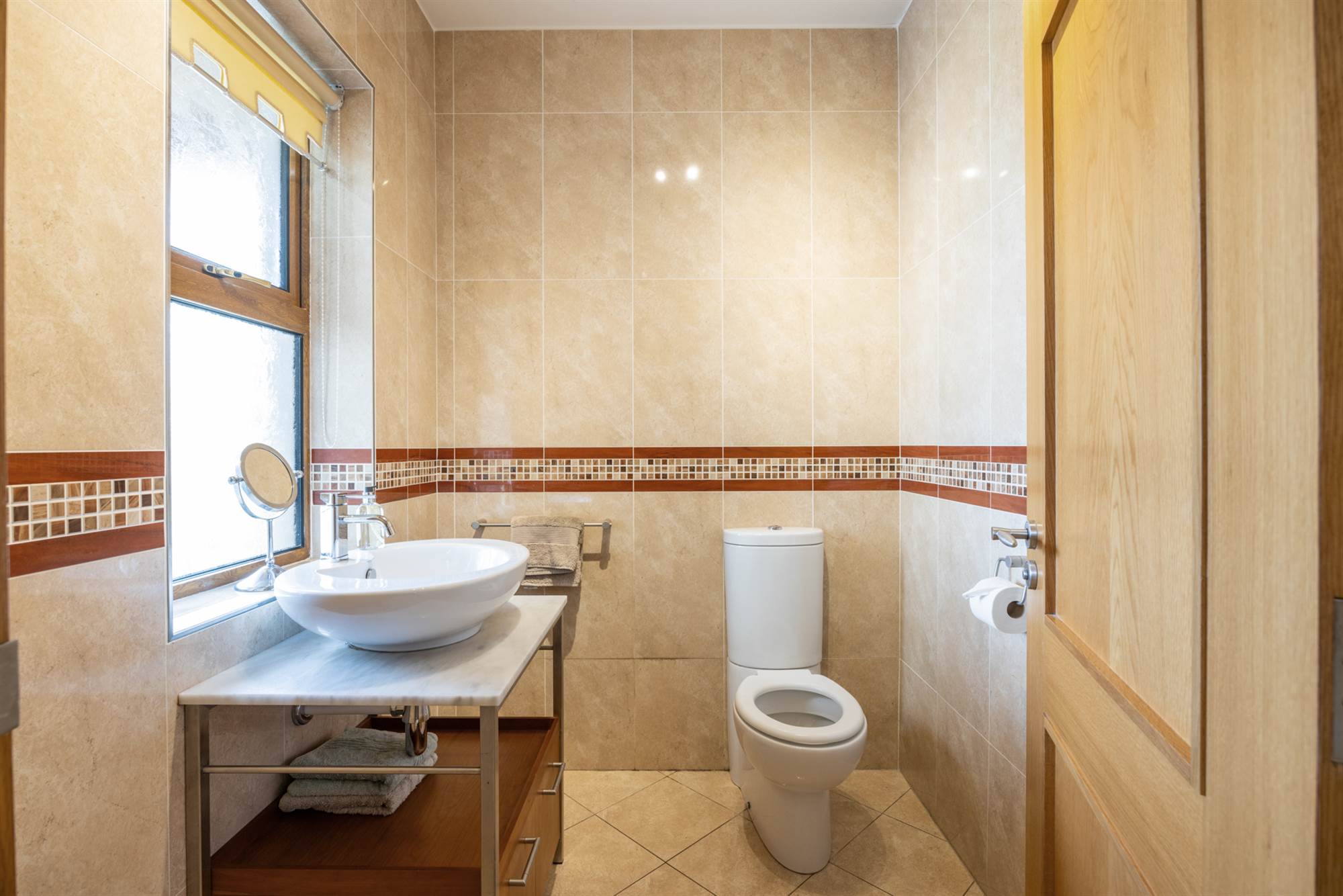 Low flush WC, wash hand basin with vanity unit, fully tiled walls and floor.