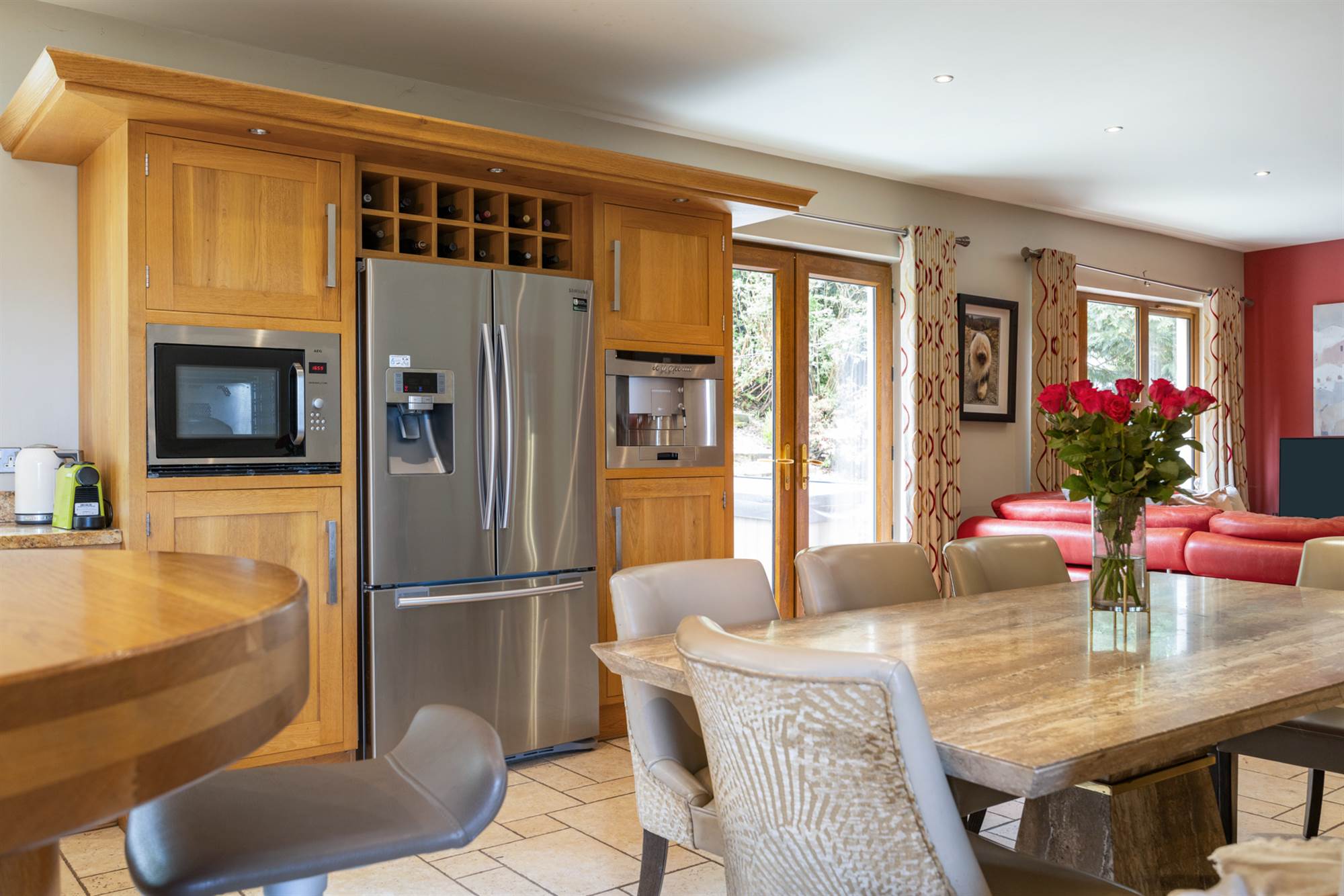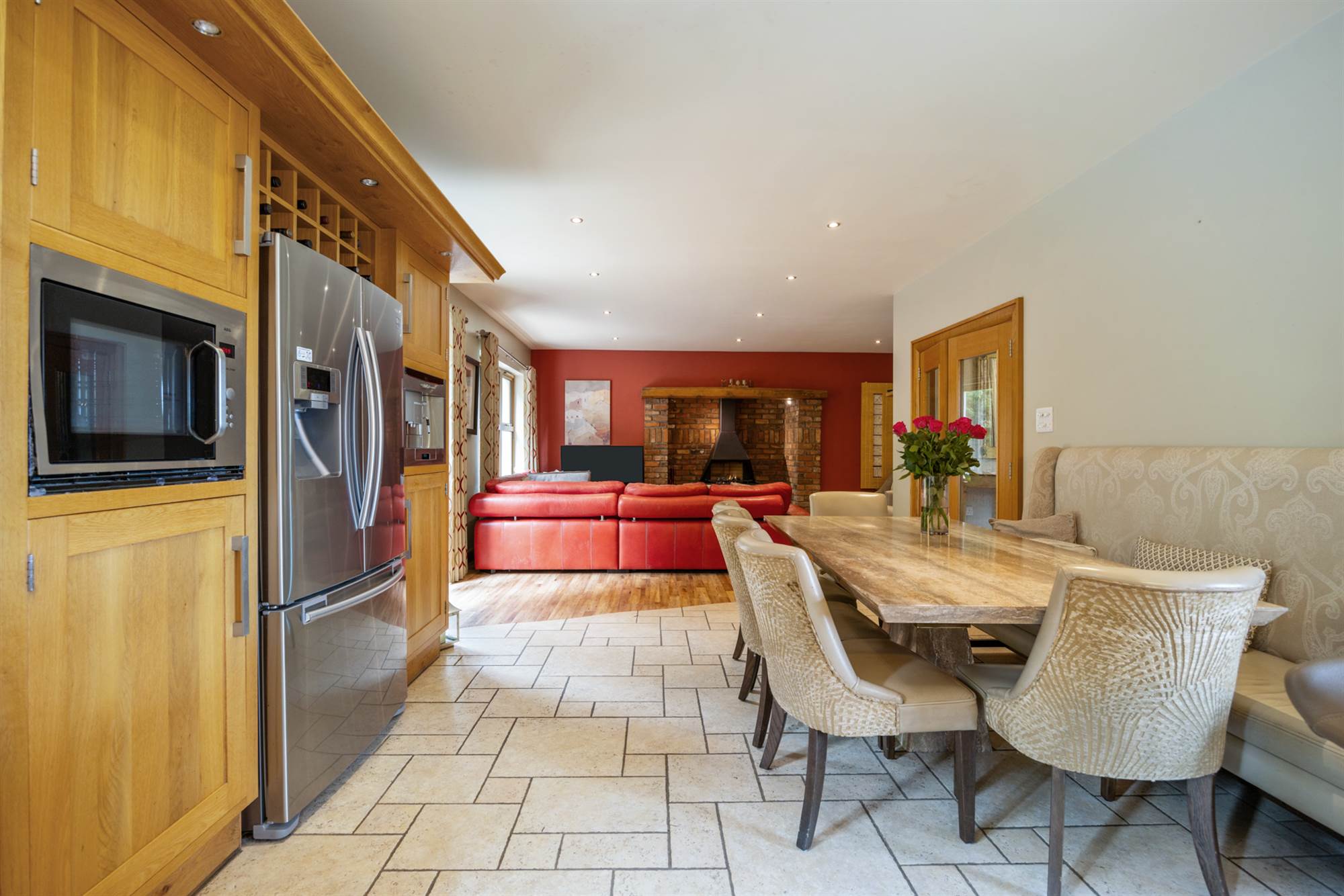 Stunning Open plan Kitchen with Granite Worktops Open to Dining/Living Area with Inglenook Belfast Brick Fireplace with gas fire