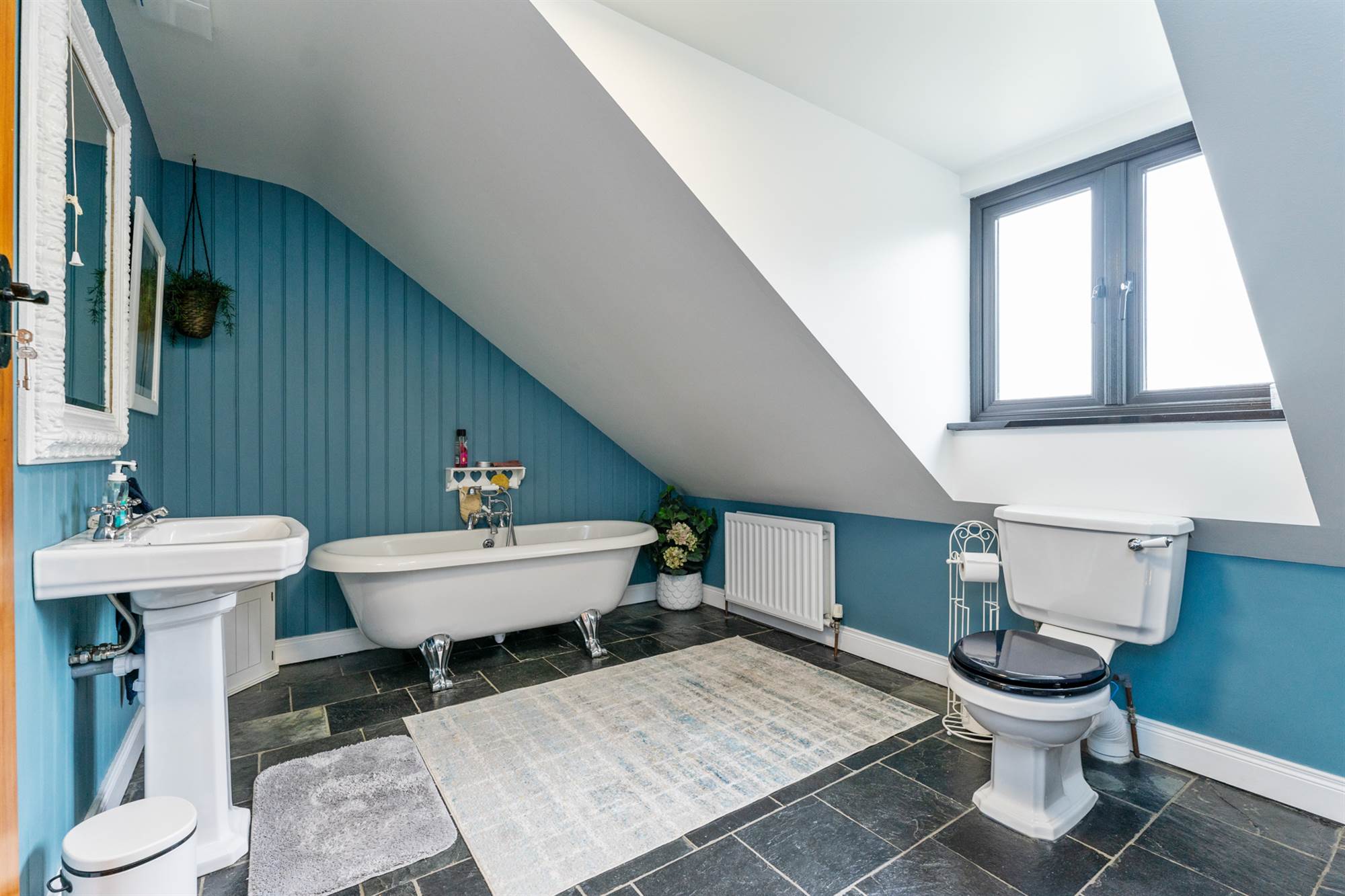 Roll Top bath, mixer taps, telephone hand shower, separate shower enclosure, low flush WC, pedestal wash hand basin