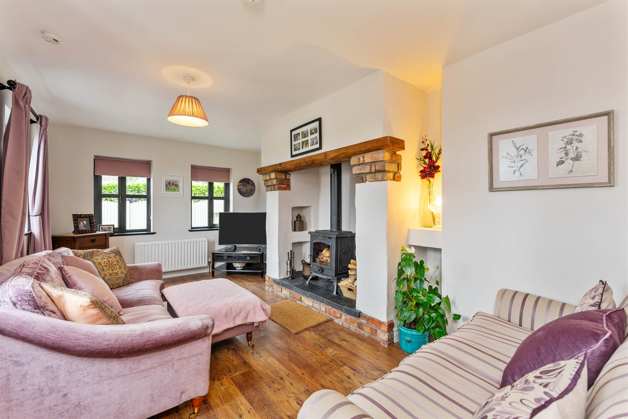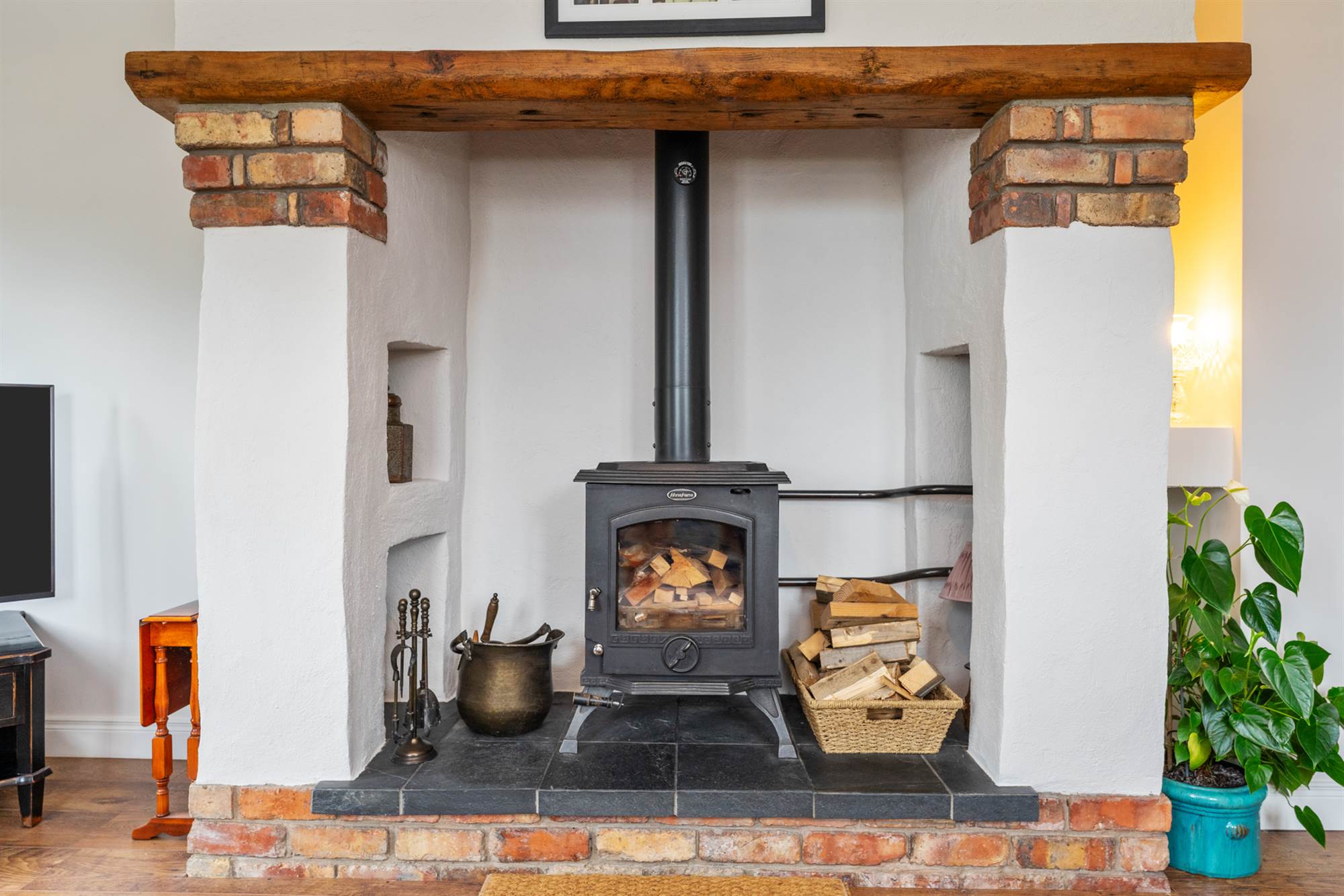 Wood Burning Stove, tiled hearth, beam mantle, wood strip flooring