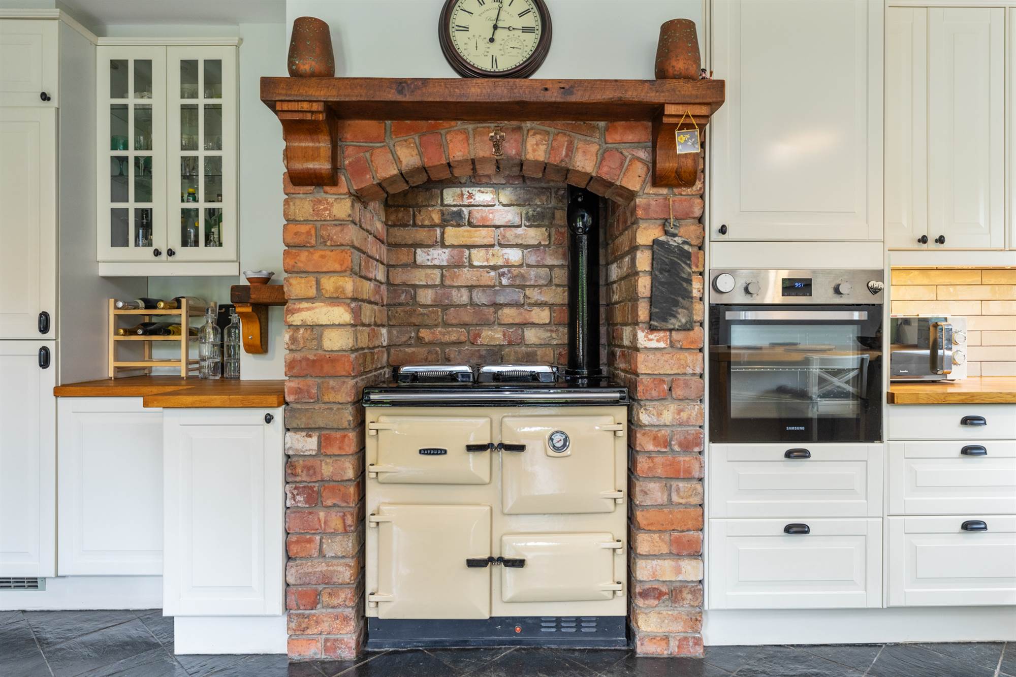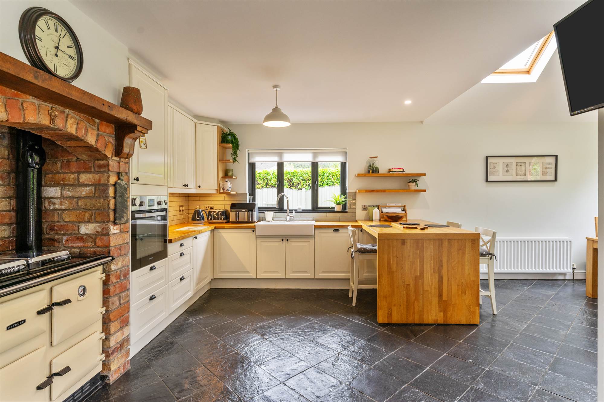 Range of High and Low Level units, inset sink, Rayburn Range, electric oven, integrated dishwasher, breakfast bar, tiled floor, double doors to rear