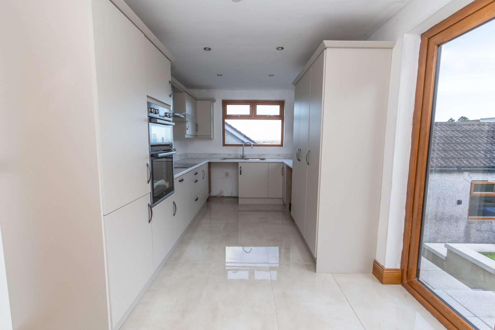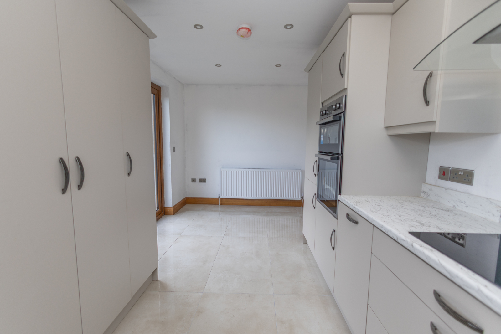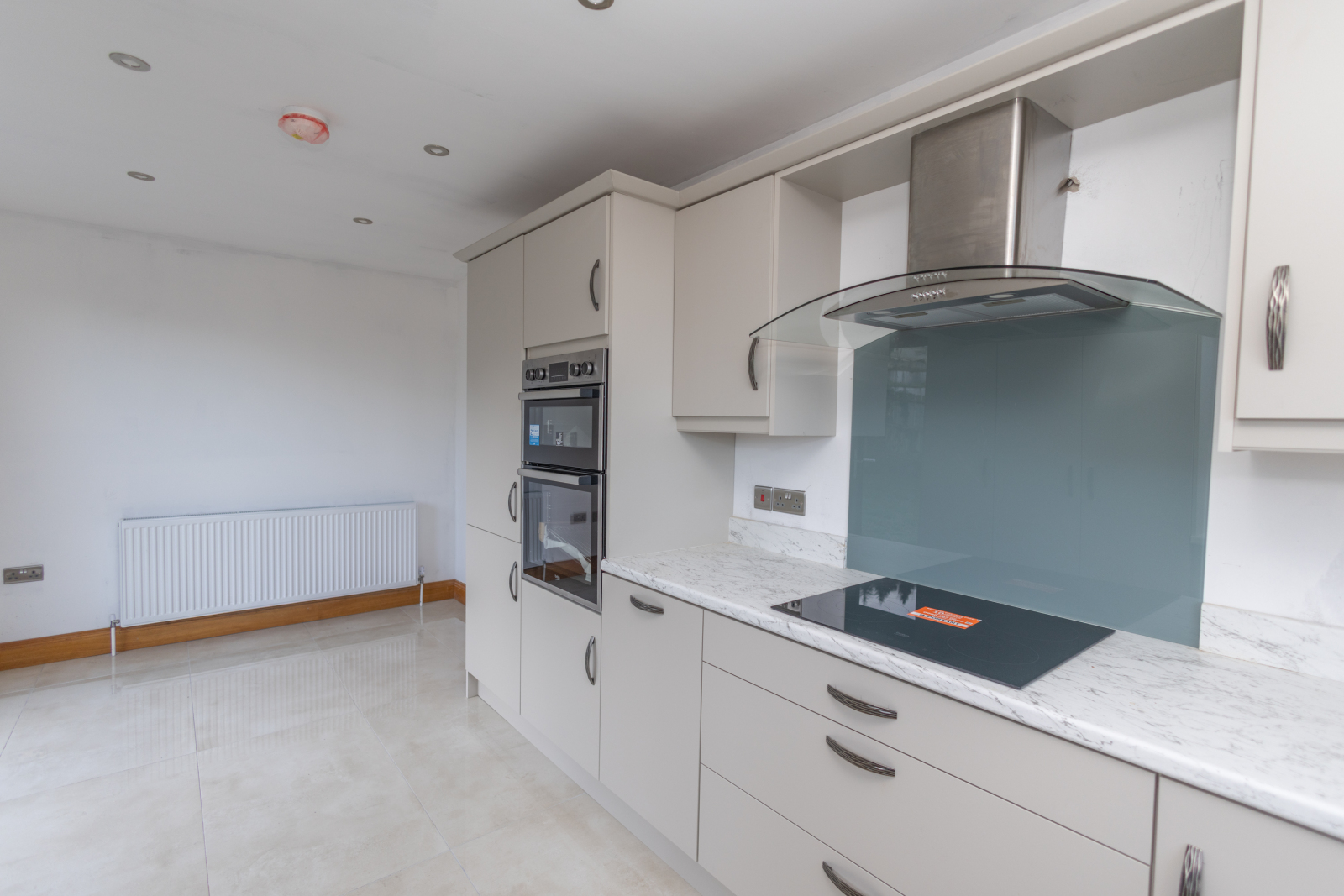 Kitchen / Dining with a newly fitted kitchen, featuring upper and lower units, laminate work surface, and PVC splashback. Integrated appliances include a Beko Oven & Grill, four-ring hob, extractor hood above, and an integrated fridge freezer. The room is plumbed for a washing machine and tumble dryer, and benefits from recessed spotlights and a double radiator. Patio doors lead to the rear garden.